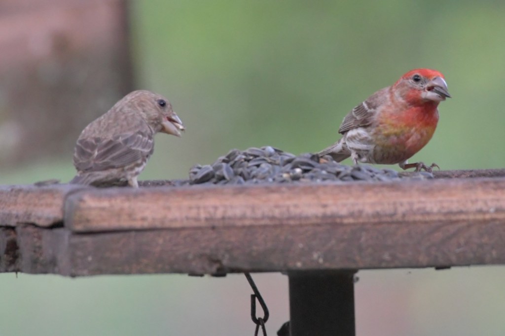 A family of House Finch have been flying around my yard the past couple of days. They must have nested in the area because the parents are showing the fledglings how to find my feeders.