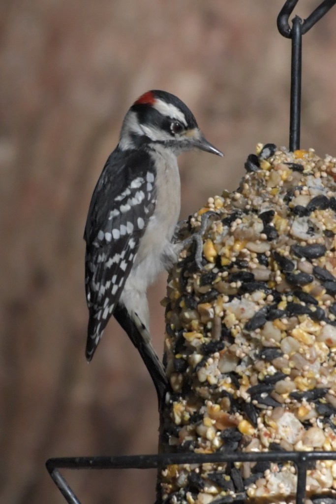Finally, I have a Downy Woodpecker visiting one of my bird feeders. Downies are in my yard ever so often. I’ve put suet feeders out in hope of drawing one in, but none came until I put out this big block.