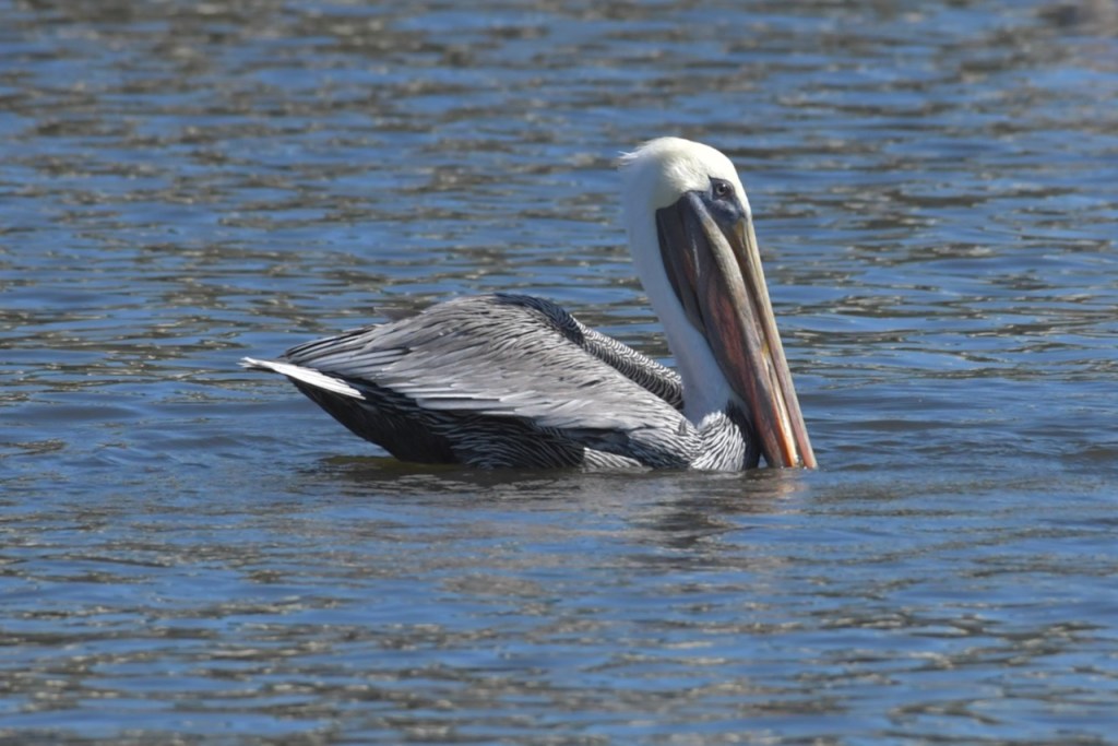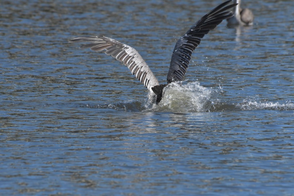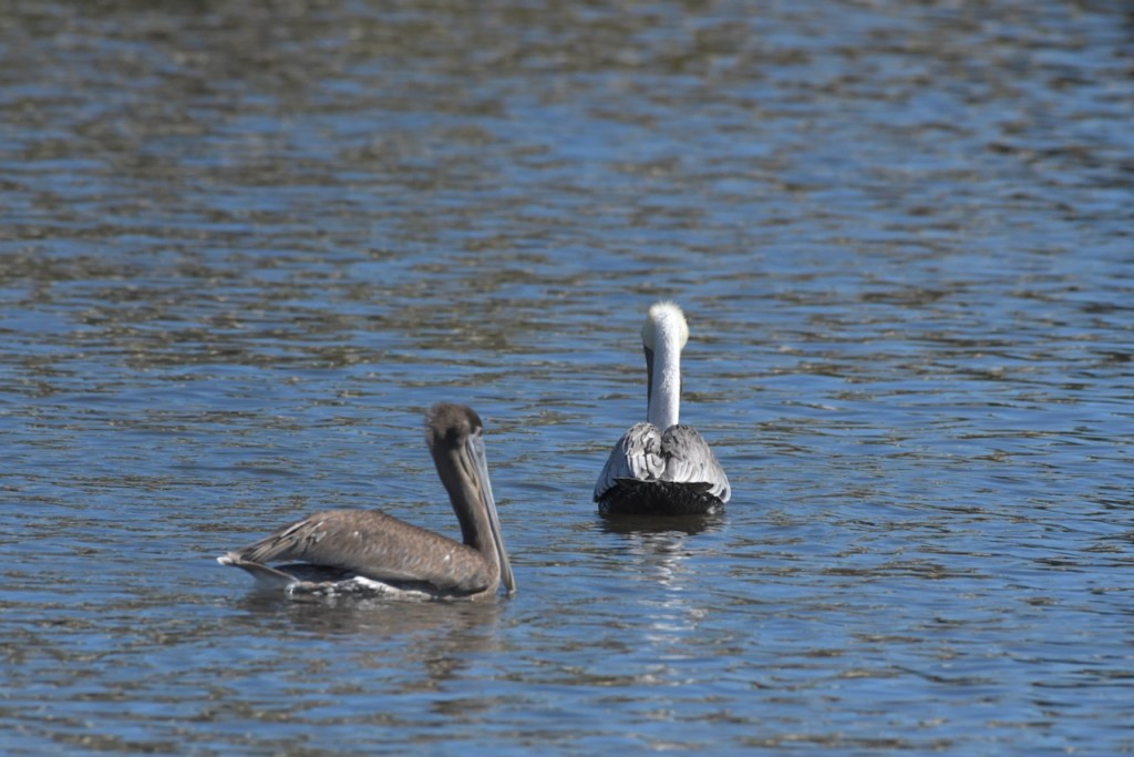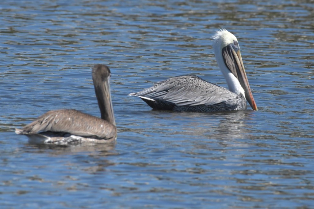 Brown Pelicans dive for their dinner. They scoop fish up in their throat pouch and then swallow them after draining out the water.