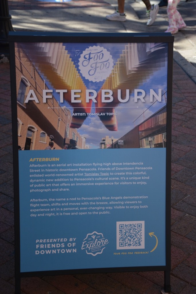 Afterburn is a public art exhibit created by Tomislav Topic for the Pensacola Foo Foo Festival. It is in honor of the Blue Angels naval flight team.