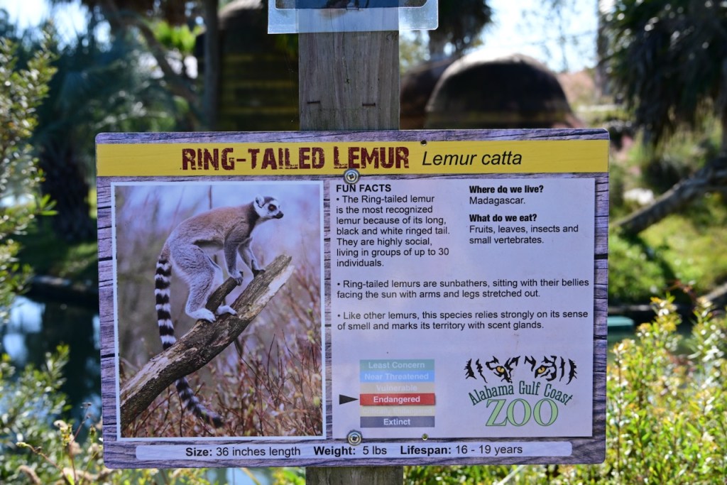 The Alabama Gulf Coast Zoo has 3 types of lemurs: Ring Tailed, Red Ruffled, and Black & White Ruffled. The Ring Tailed are on their own little island in the middle of the zoo. Lemurs are social creatures and like to live in groups.