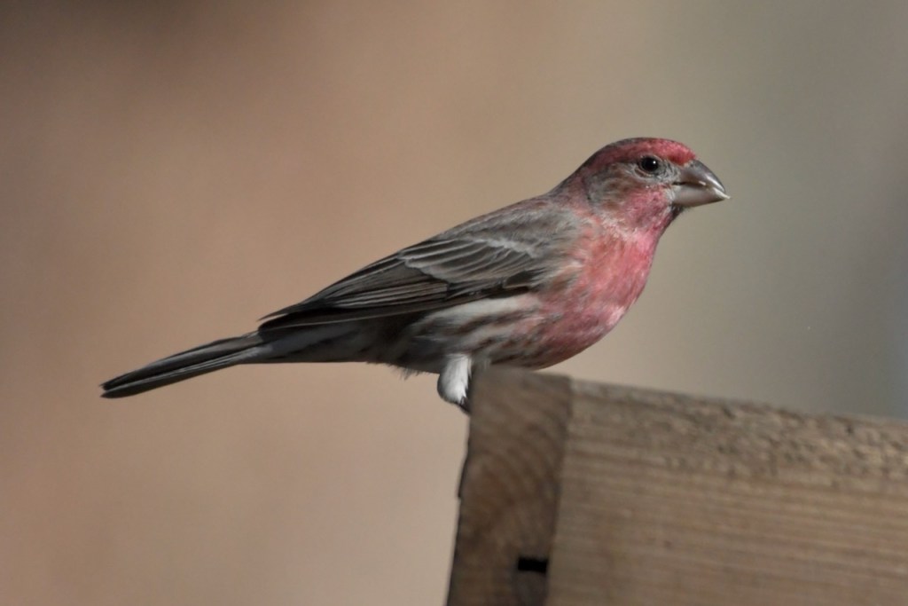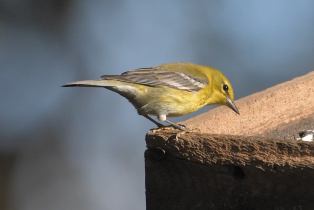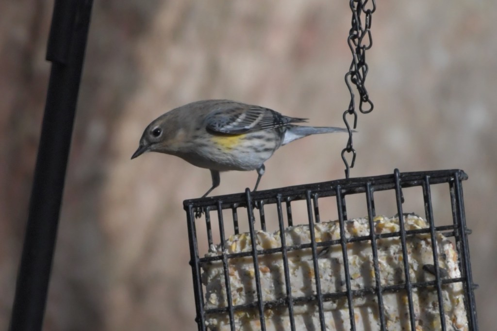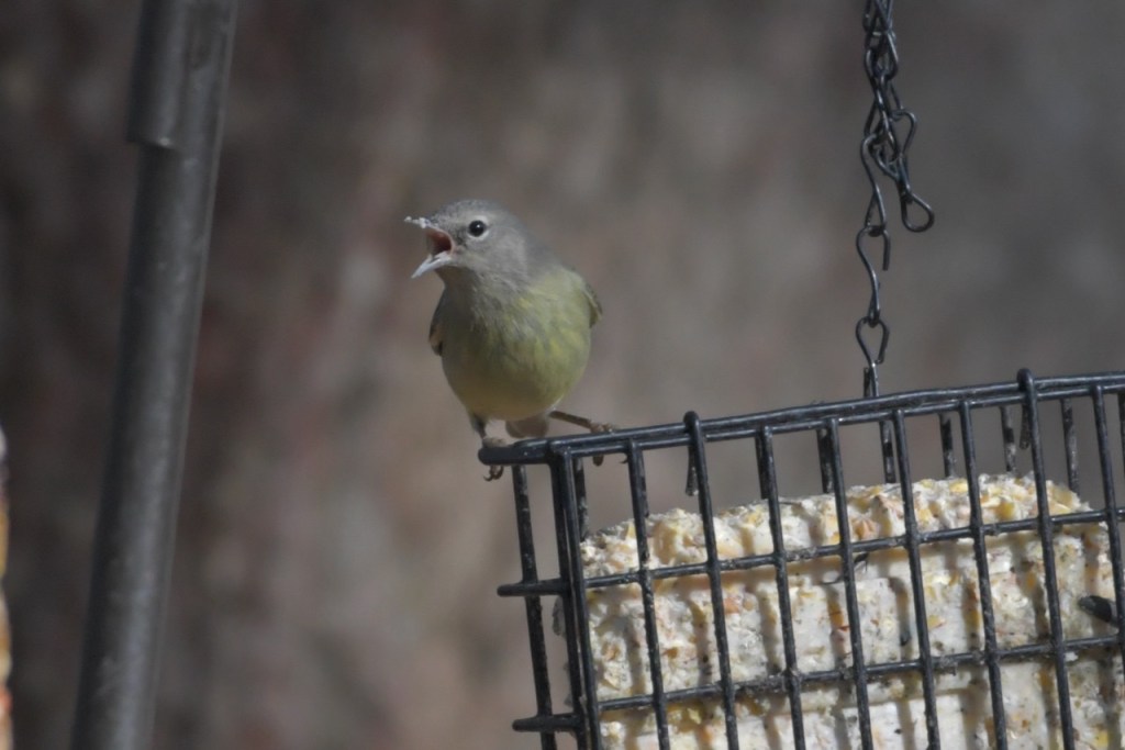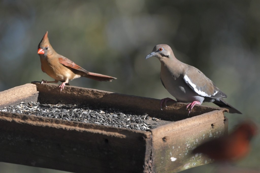 The multitude of birds that visit my feeders exhibit all the colors of the rainbow: red (Northern Cardinal and eye of the White-winged Dove), orange (Orange-crowned Warbler), yellow ( Yellow-rumped and Pine Warbler), green (the Orange-crowned Warbler is olive green), blue (Tufted Titmouse), and purple (House Finch).