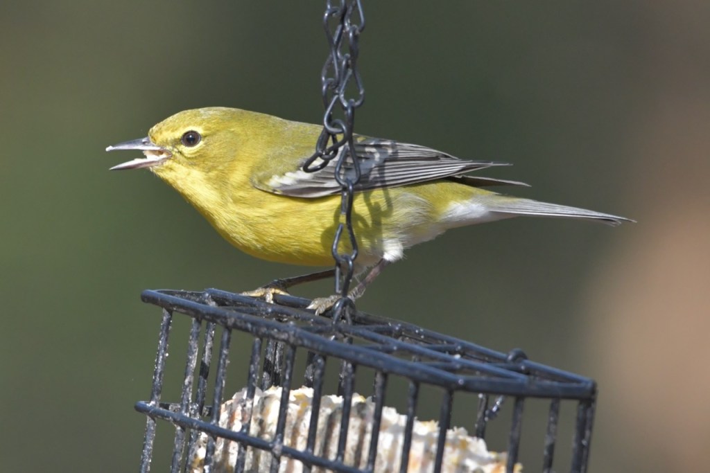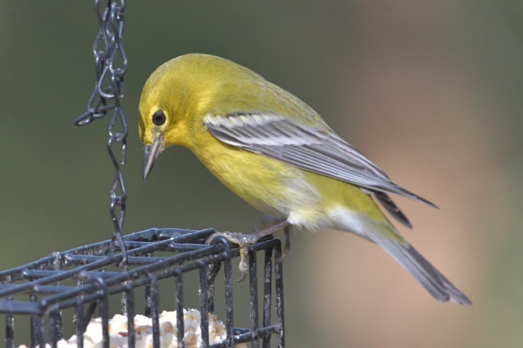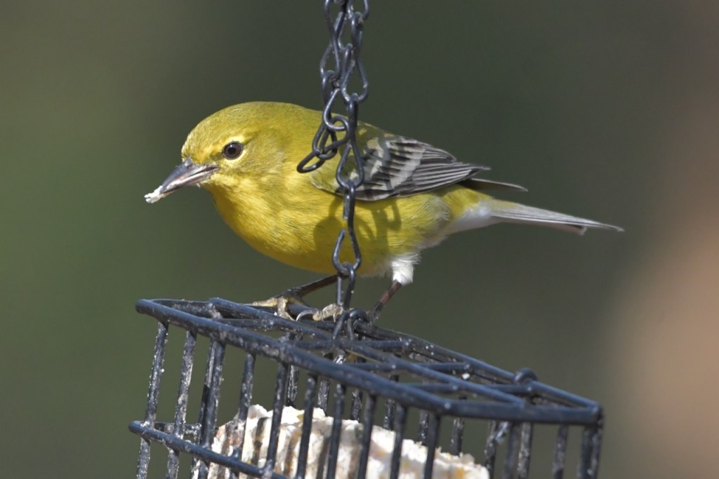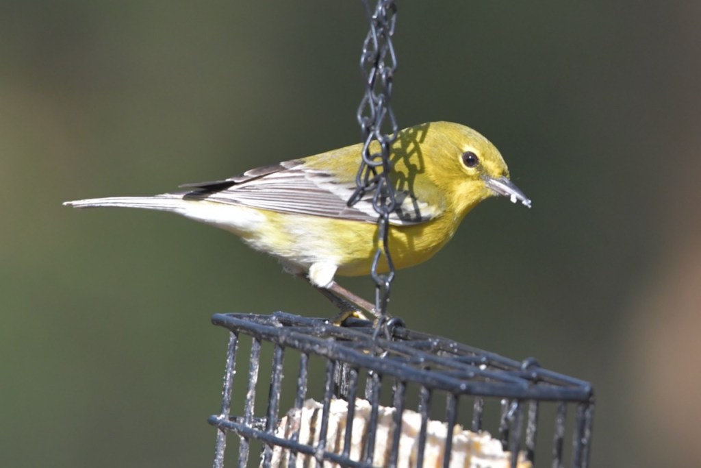 The Pine Warbler enjoys the suet as well as black oil sunflower seeds when visiting my feeders. I enjoy seeing it wherever it lands in my yard.
