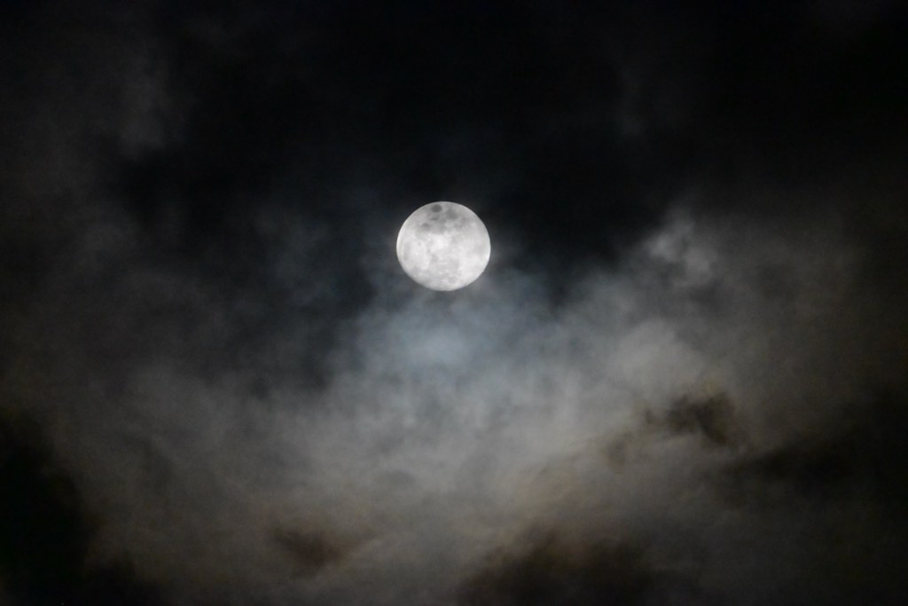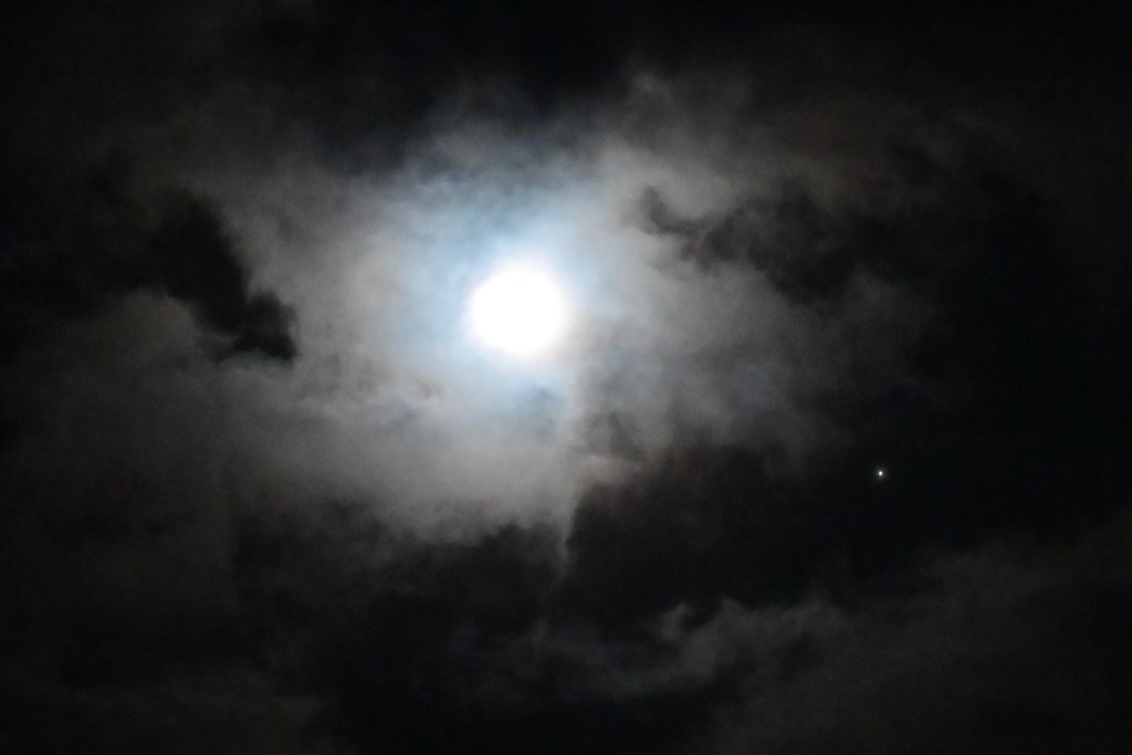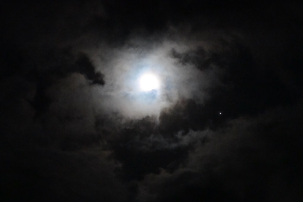 The night before the full moon, it was cloudy and the moon was a waxing gibbous moon. The planet Jupiter appeared on the right of the moon. You can make it out in the middle photo.