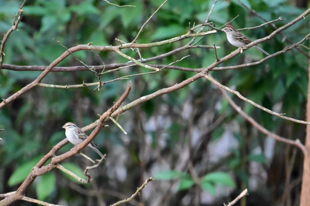 Chipping Sparrows feed on the ground, take cover in shrubs, and sing from the tops of small trees (often evergreens). You’ll often see loose groups of them flitting up from open ground. When singing, they cling to high outer limbs. On the ground they hop or run through grasses searching for seeds. https://www.allaboutbirds.org/guide/Chipping_Sparrow/id