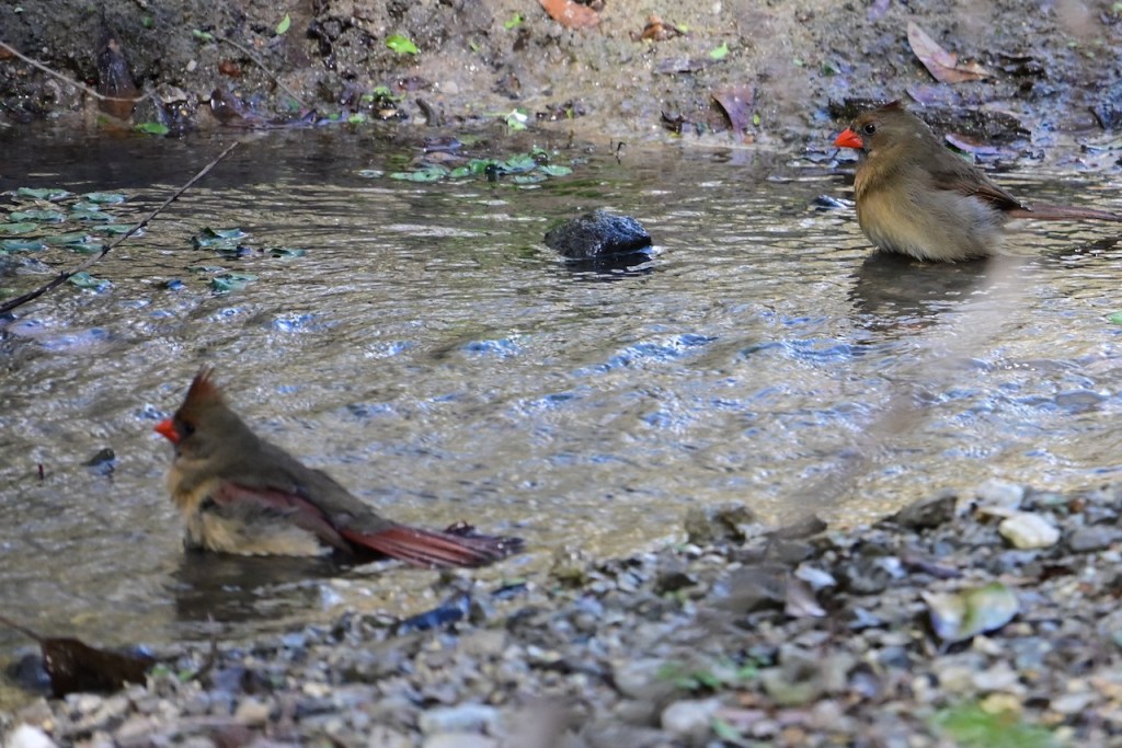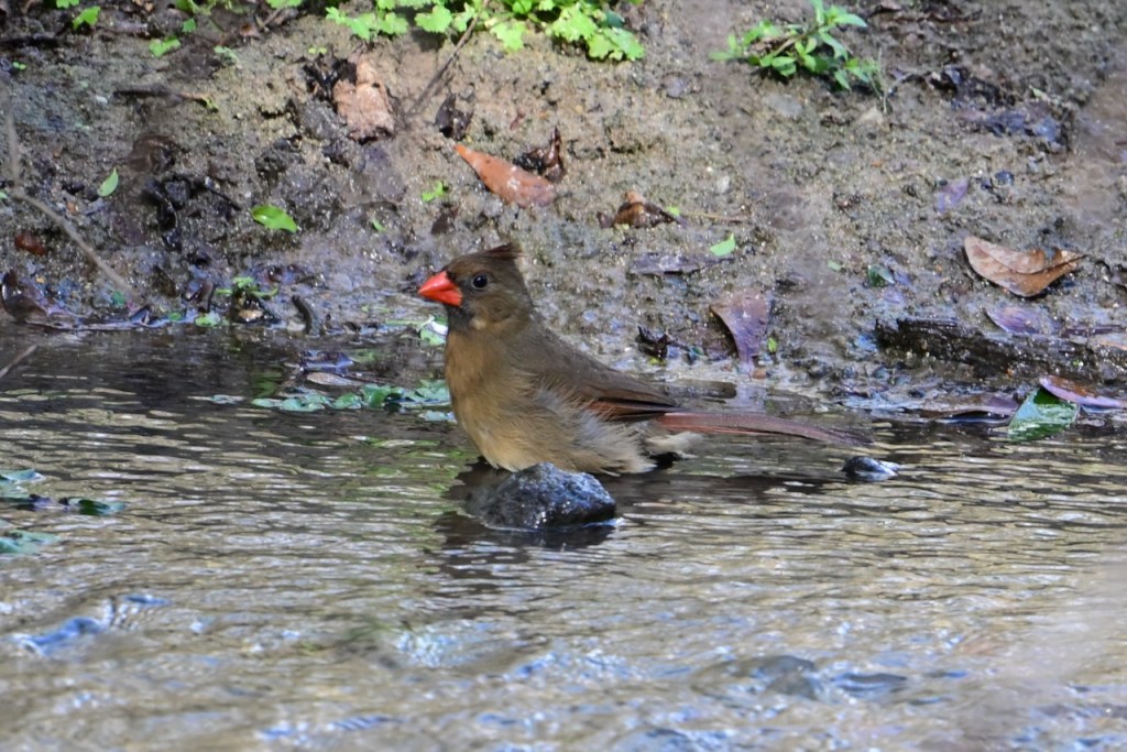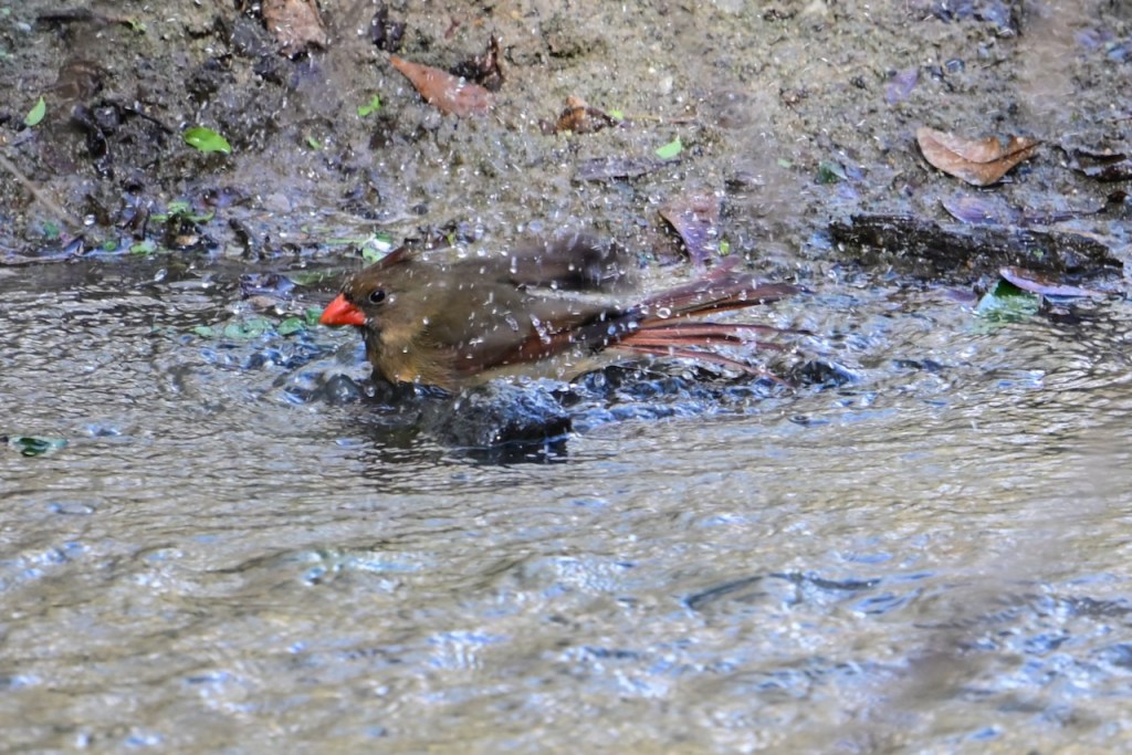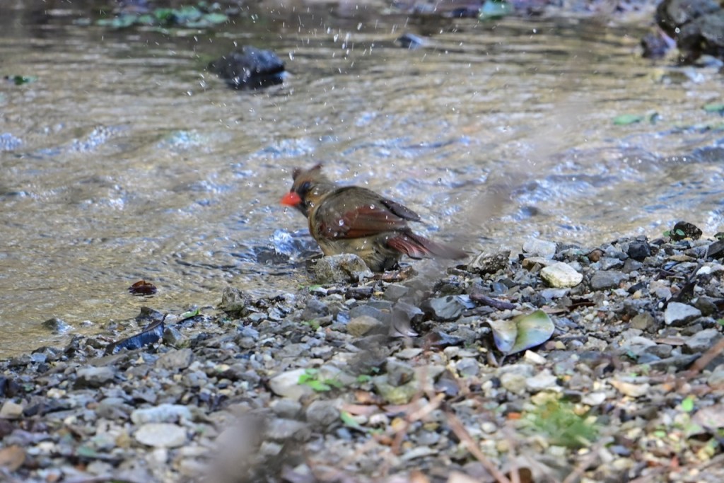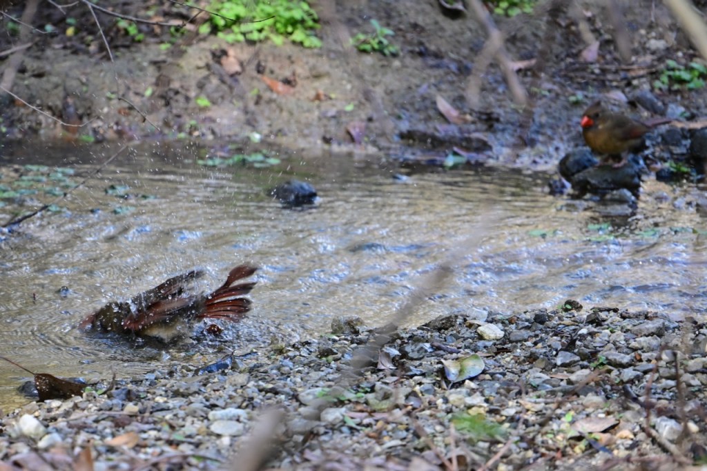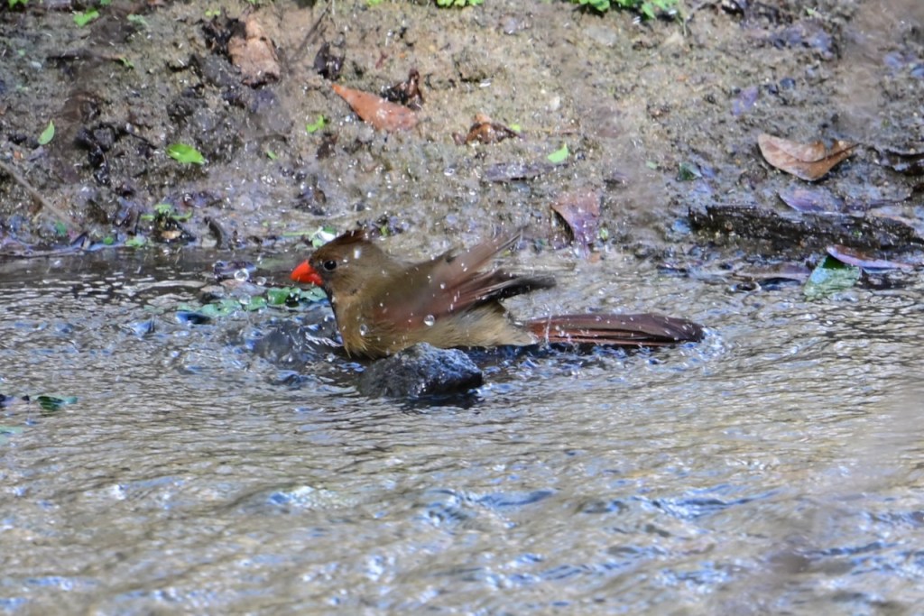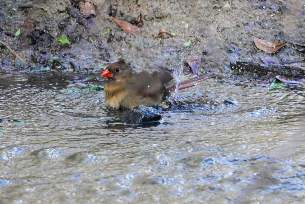 The creek behind my house is a great place to watch birds. Since the last big storm cleared out the debris in the creek bed, the birds have returned to take their baths where I can get good photos. I’ve read that birds bathe to maintain their feathers for flight, insulation, and waterproofing.