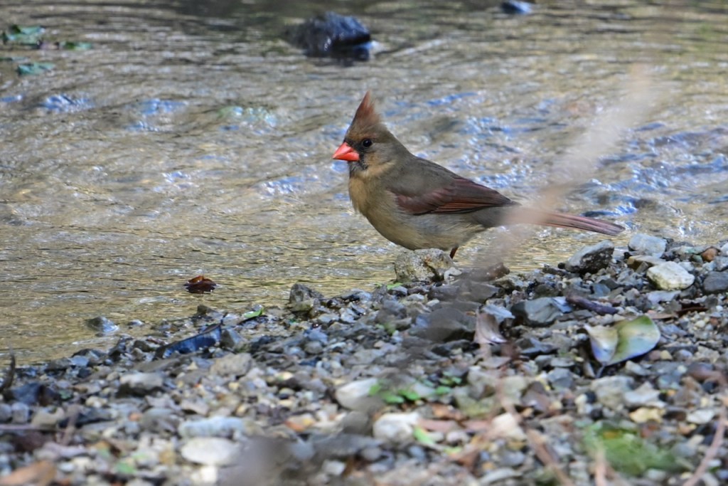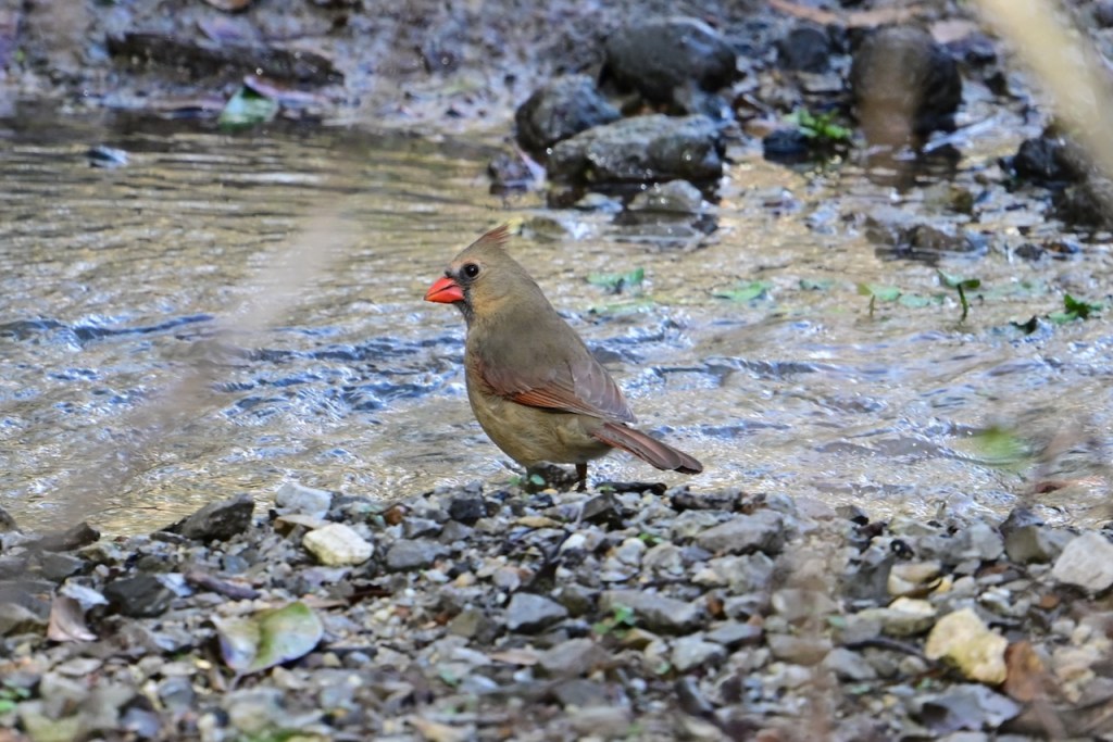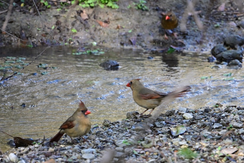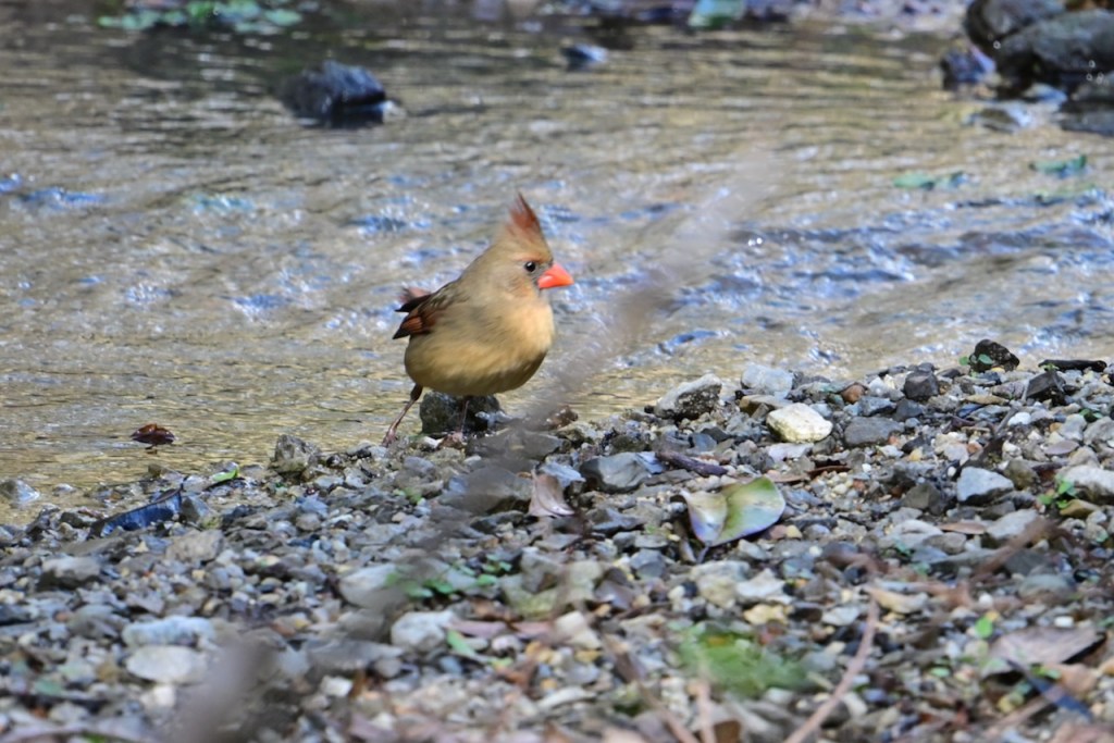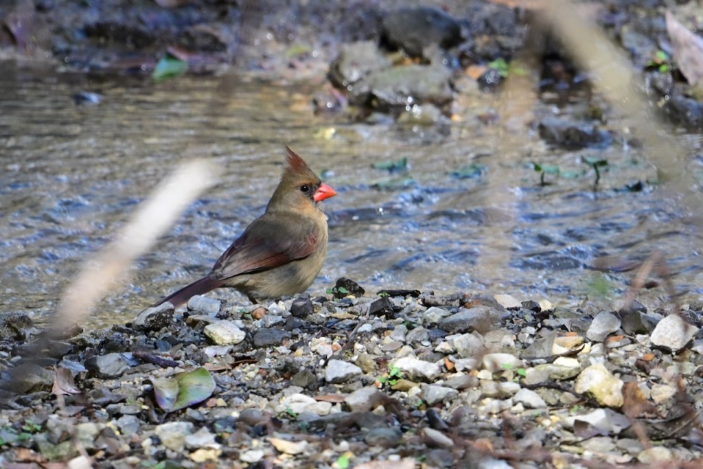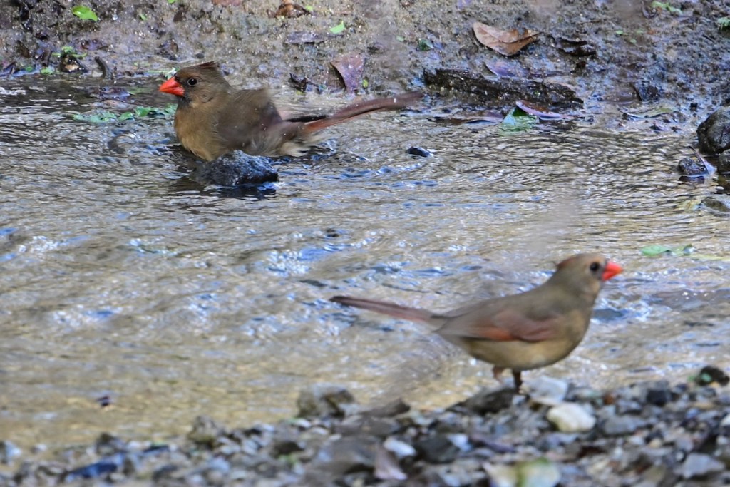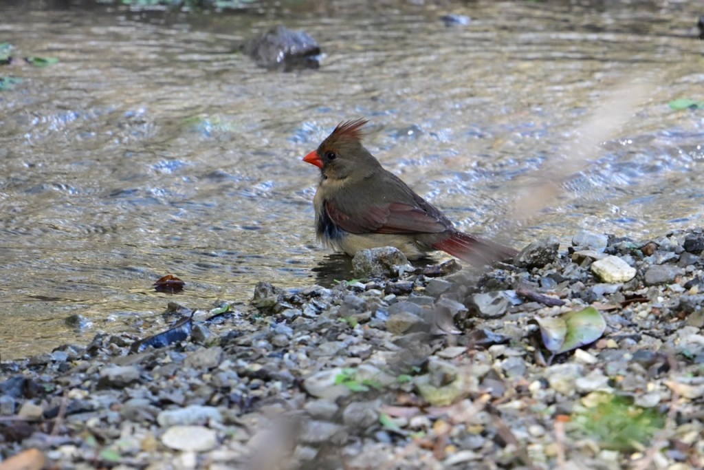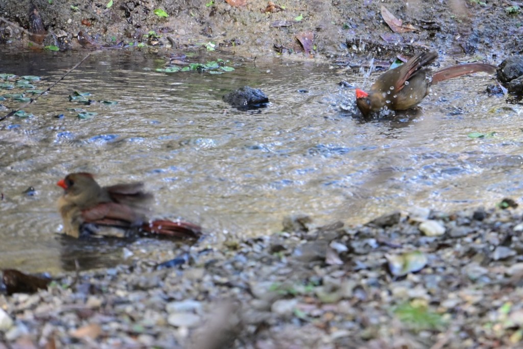 The creek behind my house is a great place to watch birds. Since the last big storm cleared out the debris in the creek bed, the birds have returned to take their baths where I can get good photos. I’ve read that birds bathe to maintain their feathers for flight, insulation, and waterproofing.