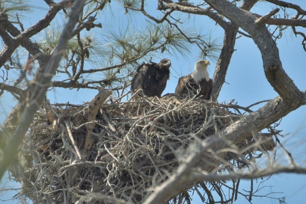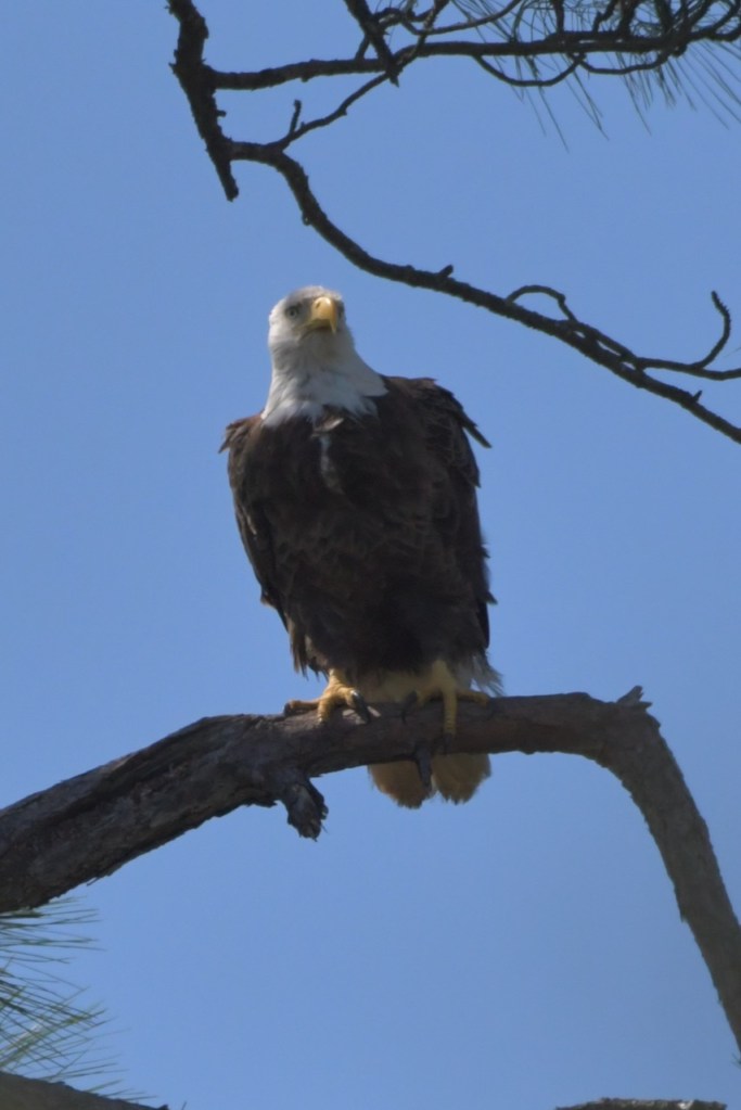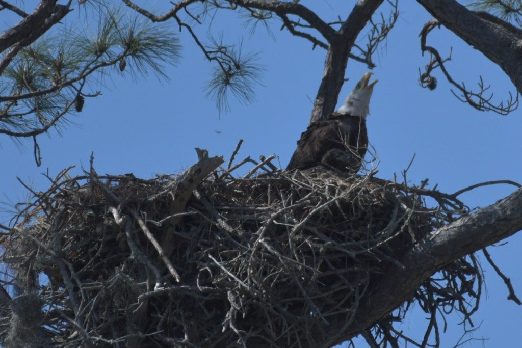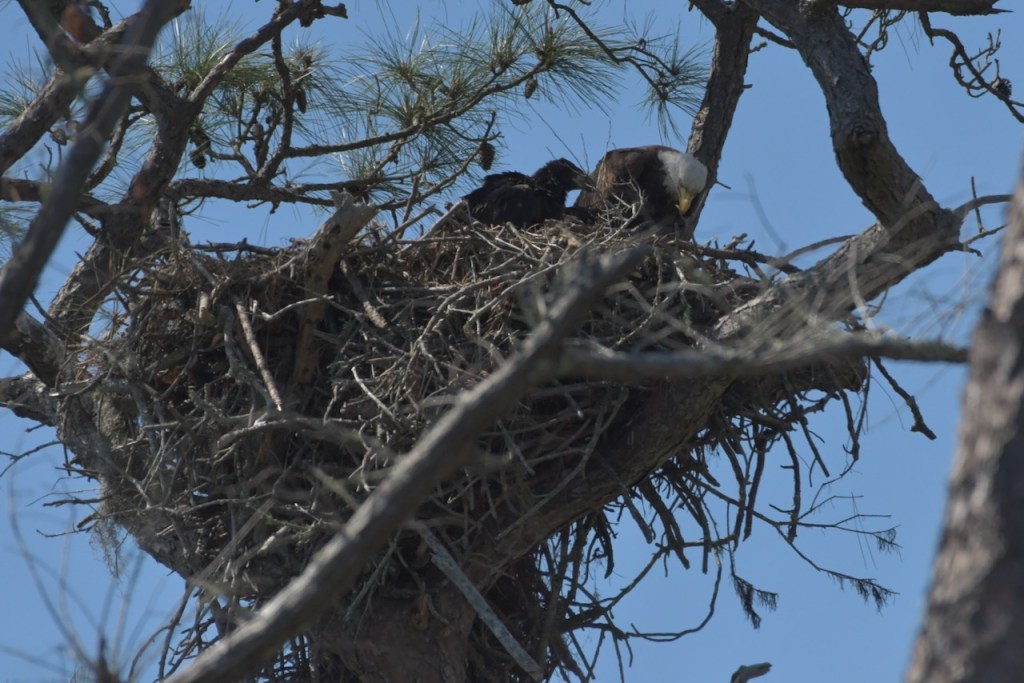 There is a second nest at Gulf State Park that can be seen from the walking path that used to be the roadway to the camping area. You can get closer to it than the other nest, but there are more trees in front of it and you have to move around to get a good viewpoint. One parent was in the nest and the other was hanging around the area. It waited on another tree and then flew off to go fishing.