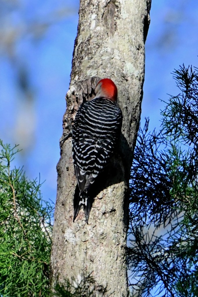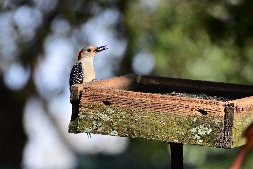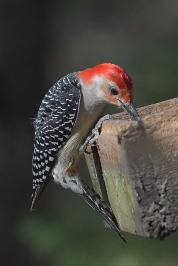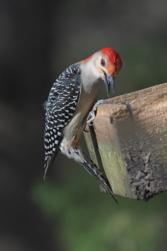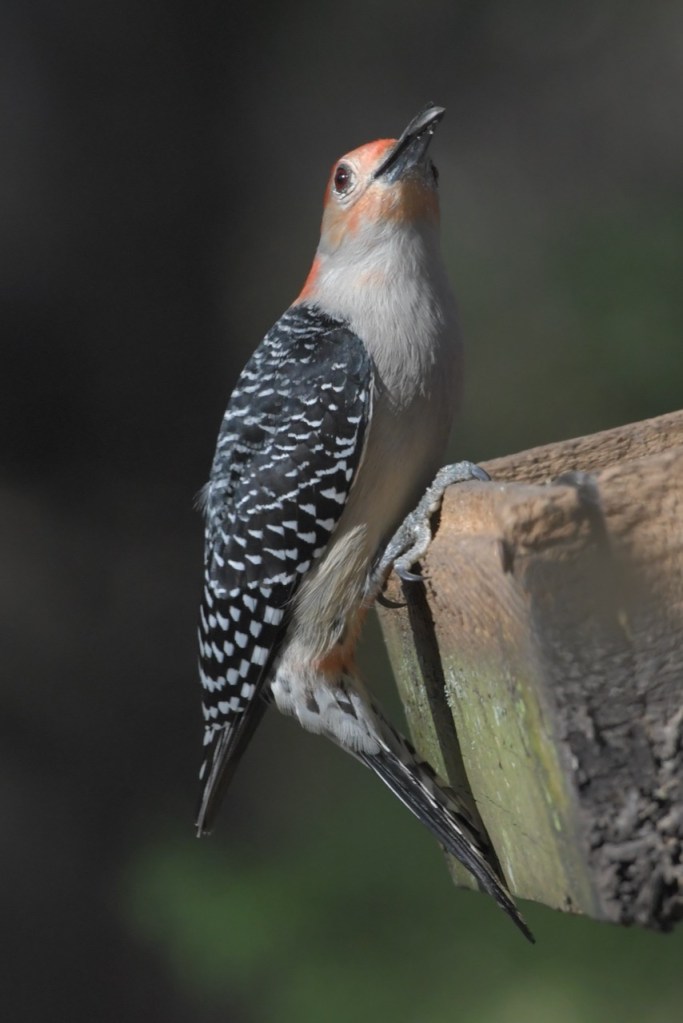 It is hard to see how this woodpecker got its name: Red-bellied Woodpecker. You hardly ever see its belly. You have to see it from just the right spot to notice the pale red belly. It is a fun bird to watch at the feeder because it will chase off the other birds, and then only stay a few seconds to pick up a sunflower seed and fly off to a tree.