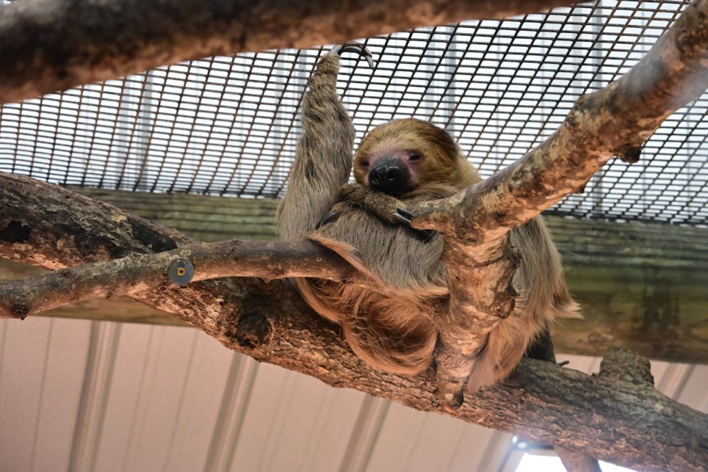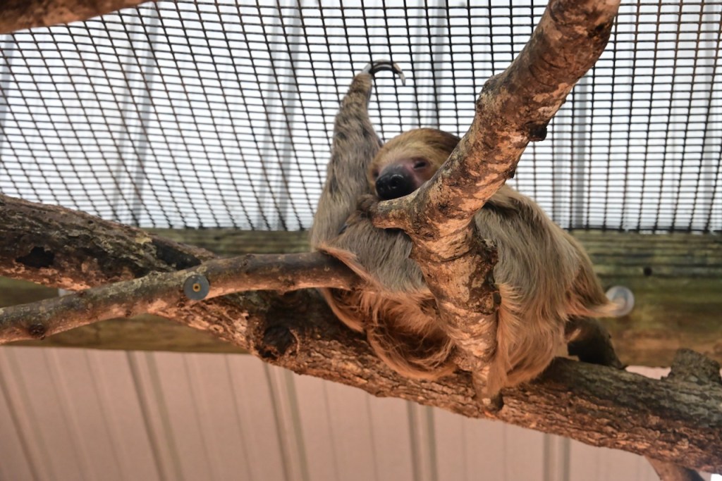 The Two-toes Sloth is nocturnal, so this one is probably sleeping. They do everything hanging upside down. https://ielc.libguides.com/sdzg/factsheets/twotoedsloths/behavior