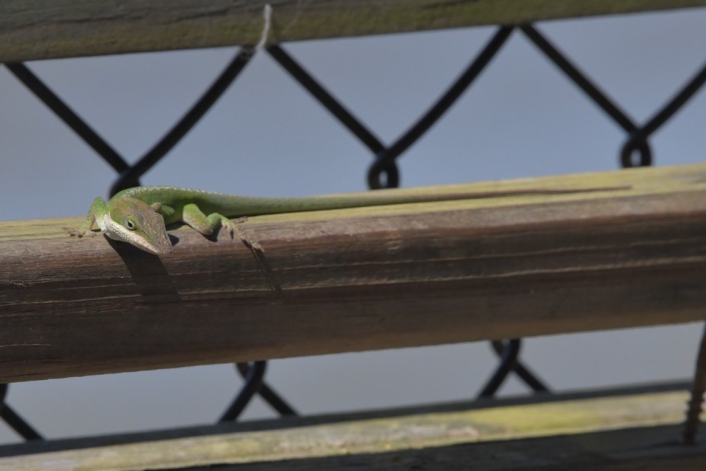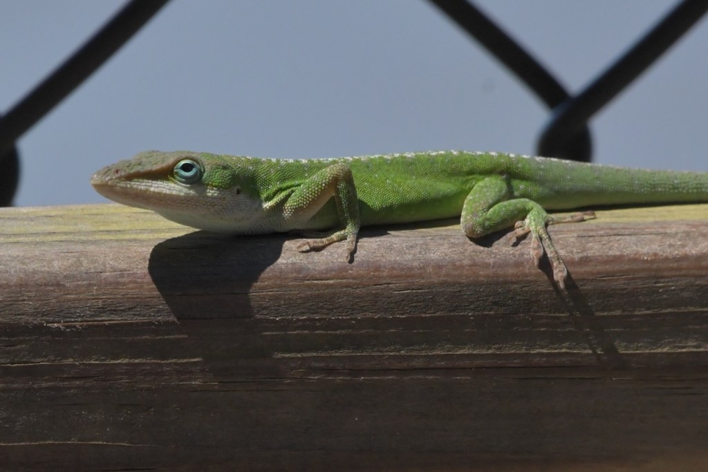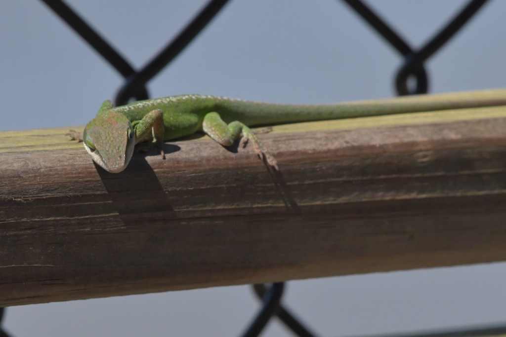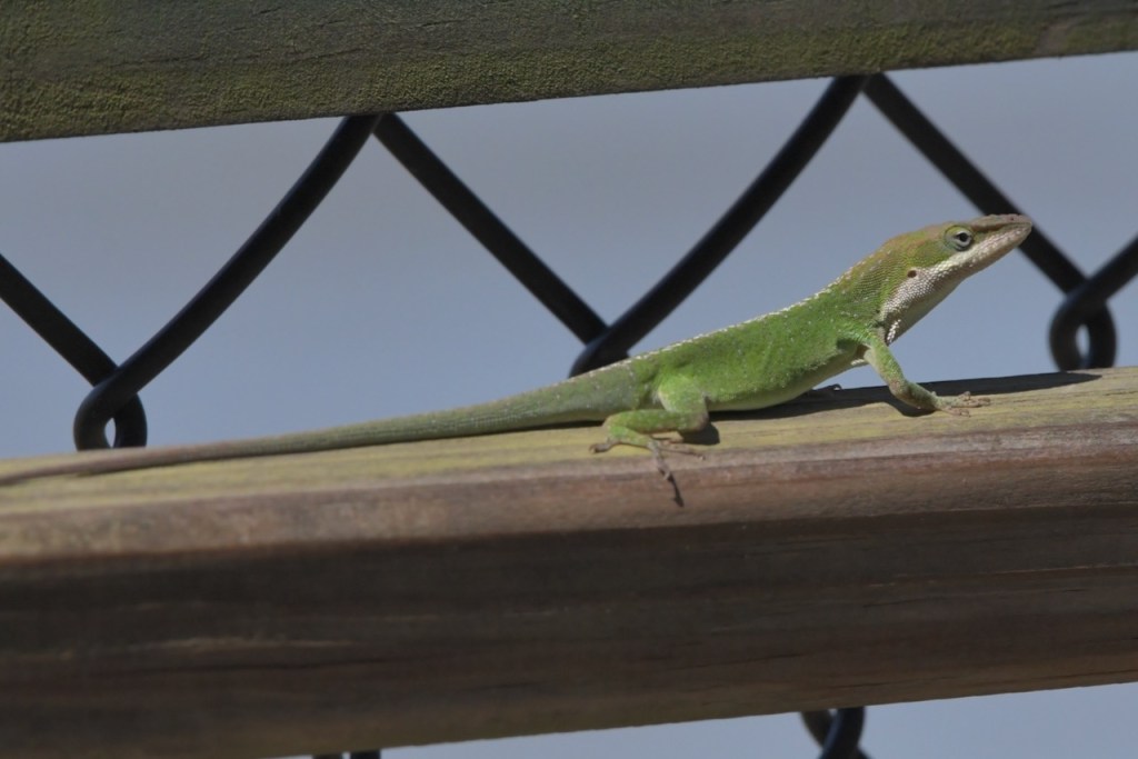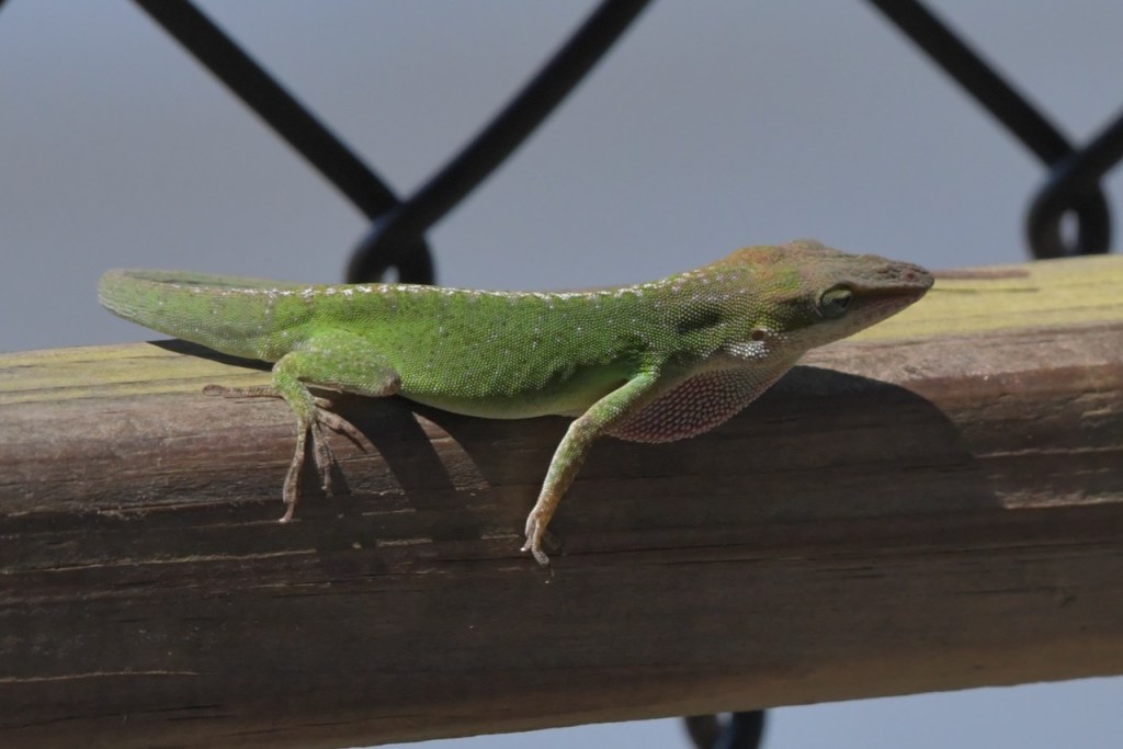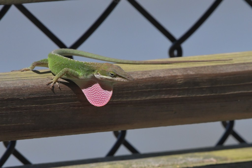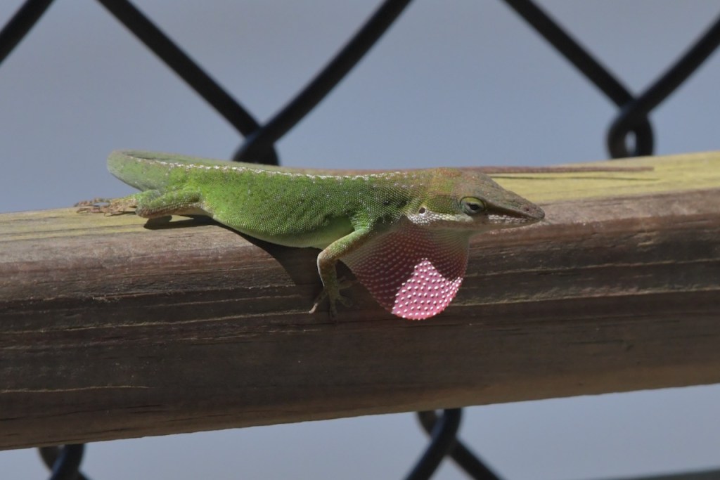 The green anole is often called ‘chameleon’ because of their ability to change colors from bright green to brown. Males have a bright pink dewlap (flap of skin) that hangs beneath the neck. https://alabamawildlife.org/wonders-of-wildlife-green-anole/