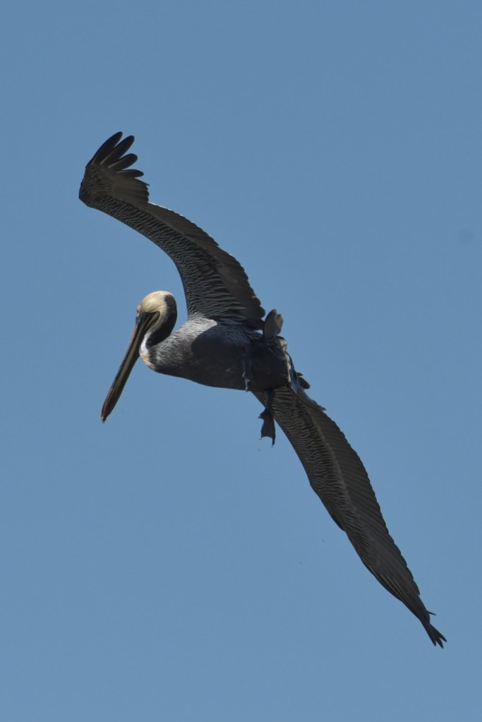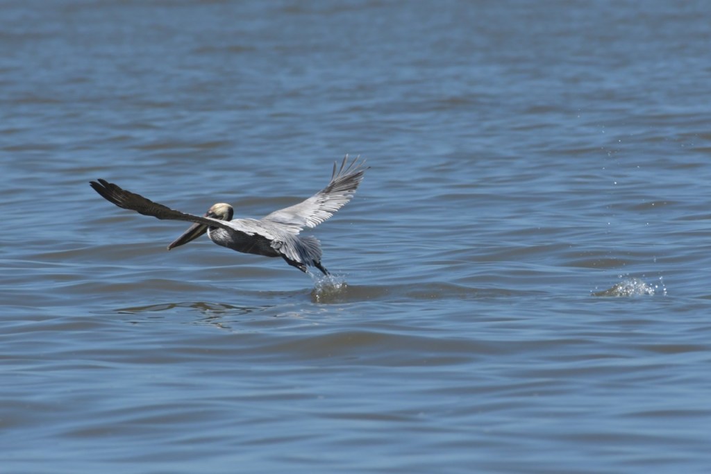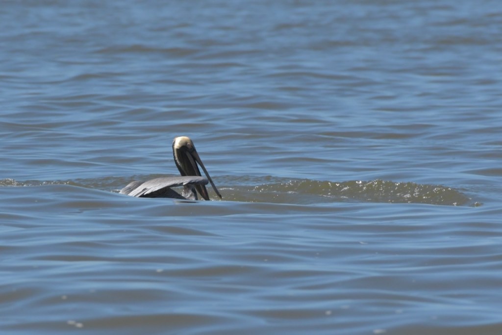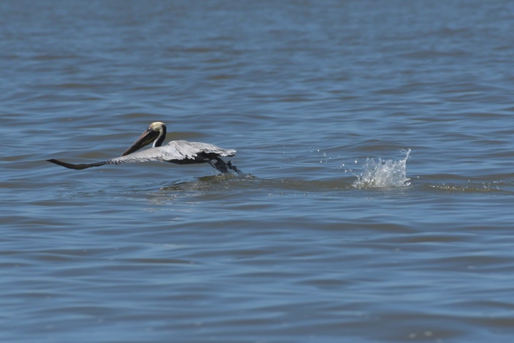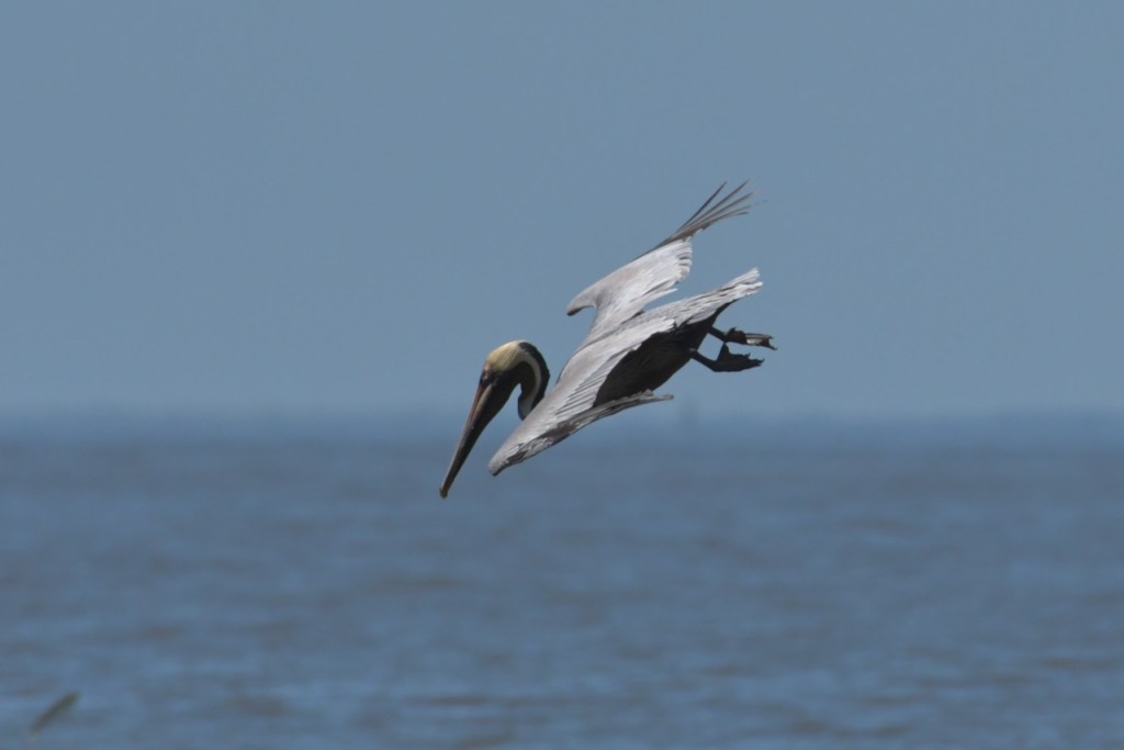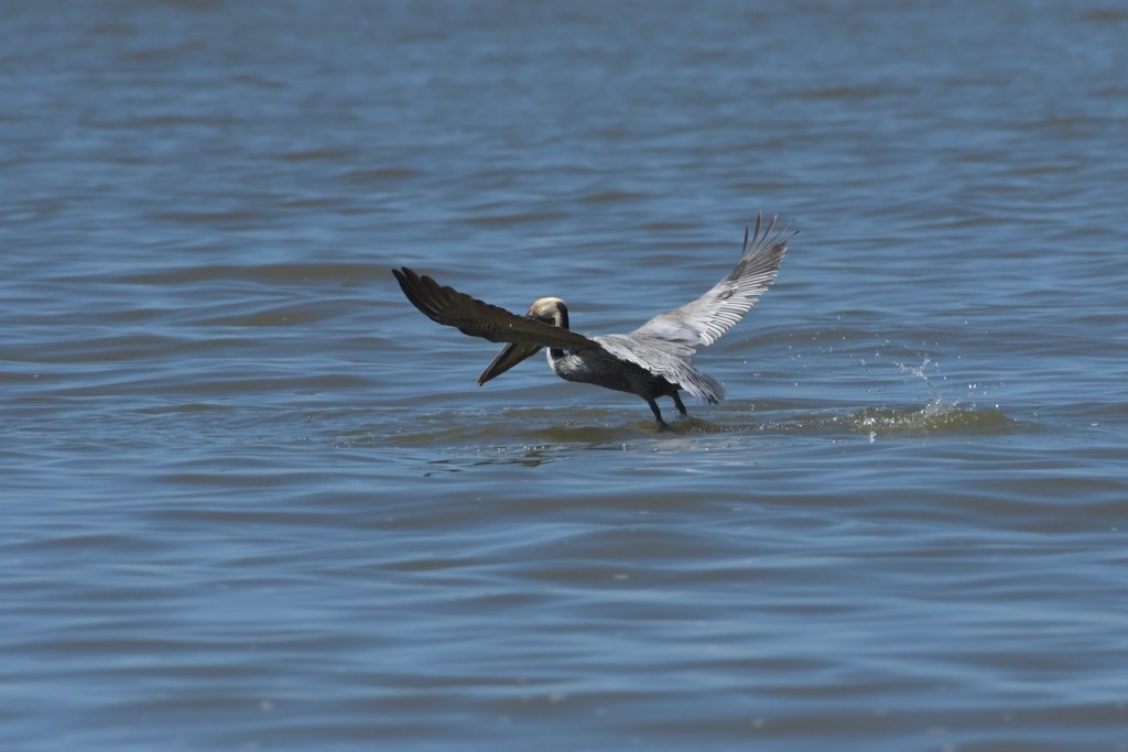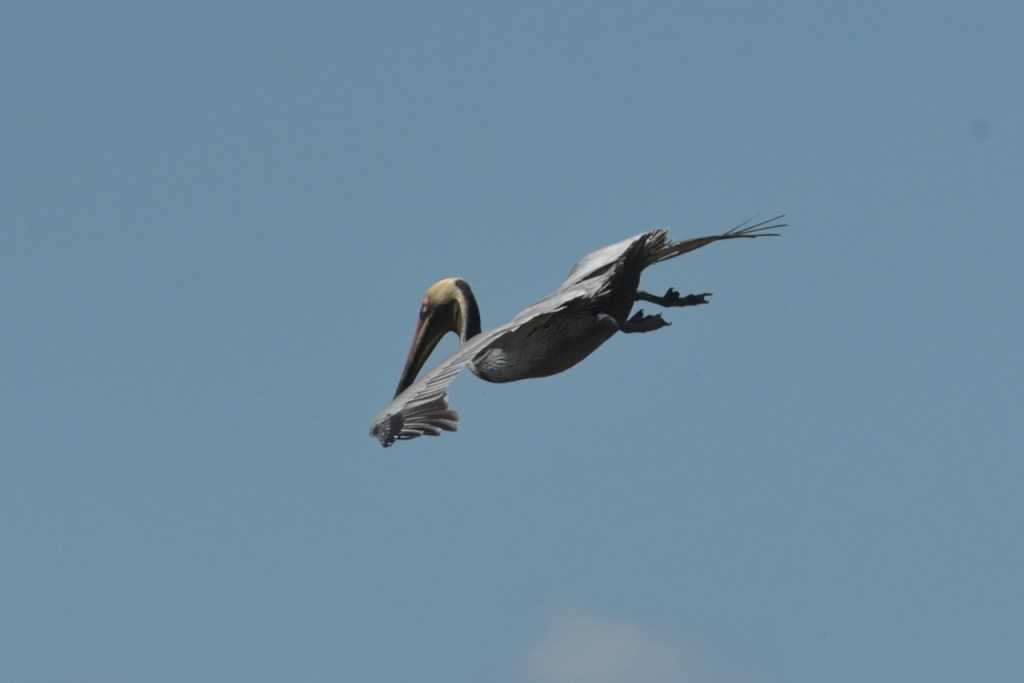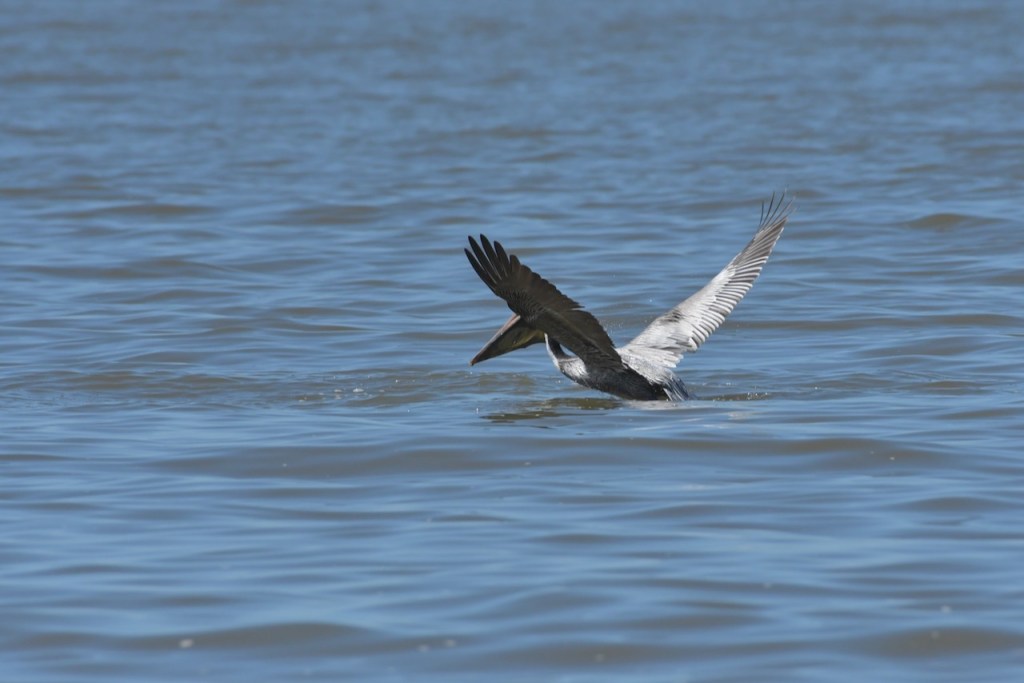Brown Pelicans dive for their fish. I found it interesting that they would dive and spin around to capture the fish in their gular pouch. They sit in the water for a few minutes to strain the water and then swallow the fish. Once that is done, they take off and look for another fish.
