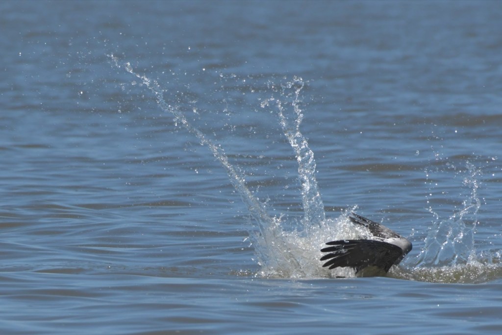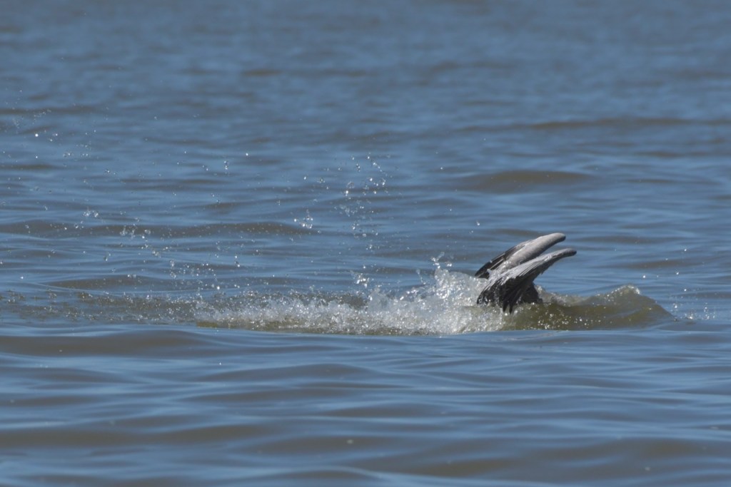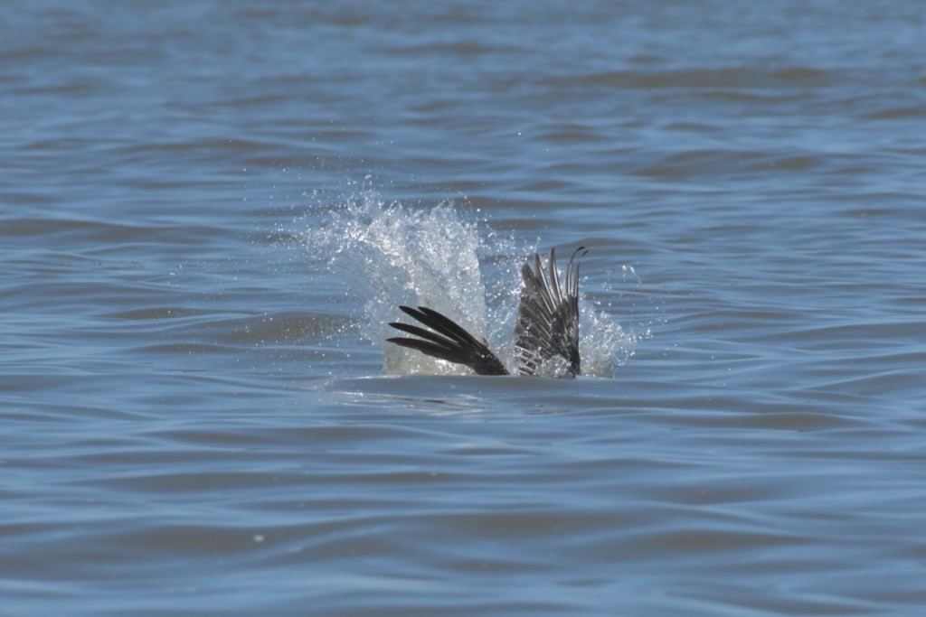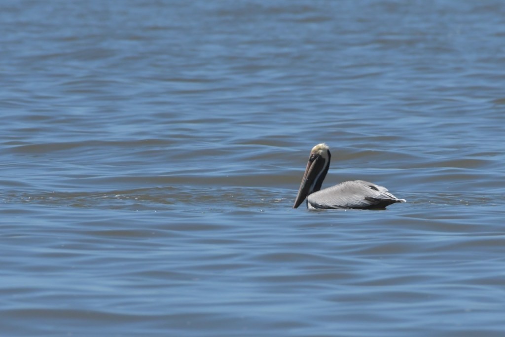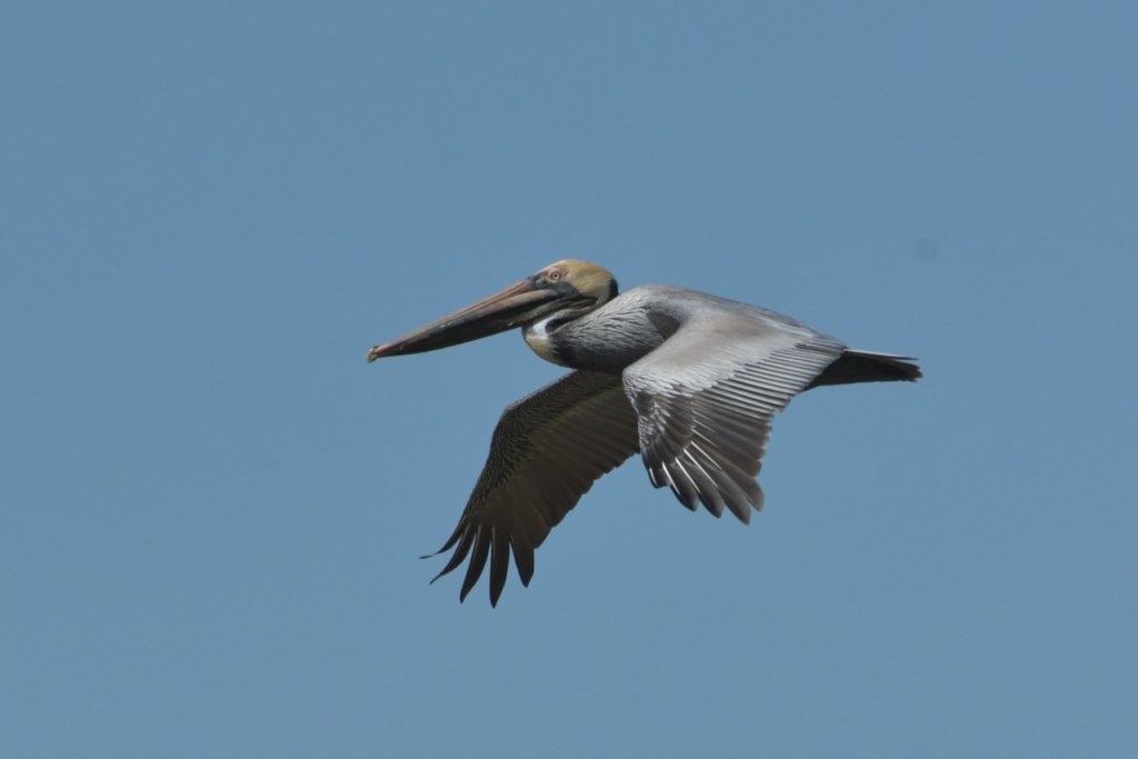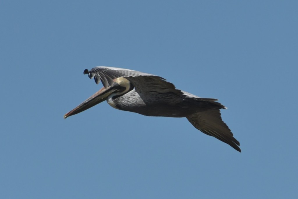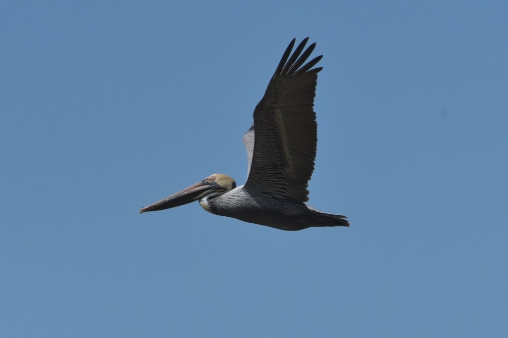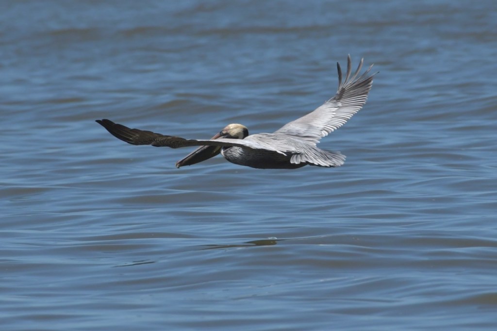 Brown Pelicans dive for their fish. I found it interesting that they would dive and spin around to capture the fish in their gular pouch. They sit in the water for a few minutes to strain the water and then swallow the fish. Once that is done, they take off and look for another fish.