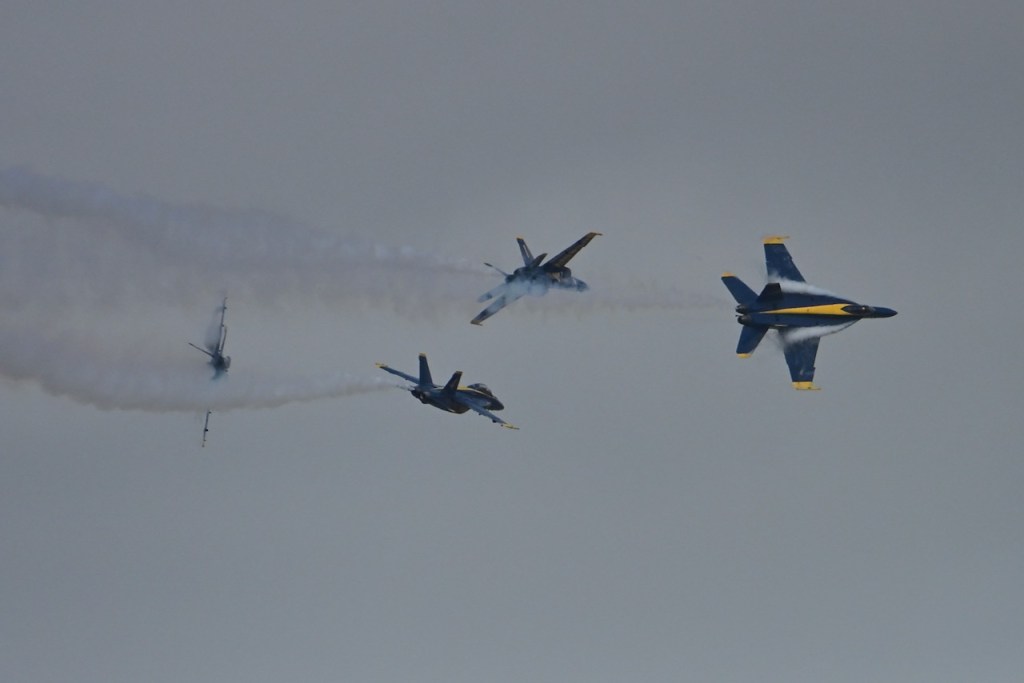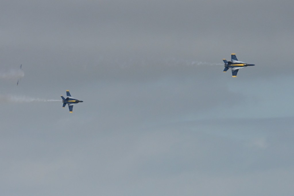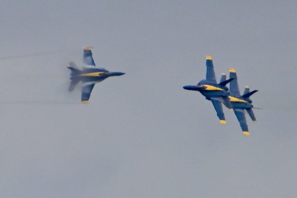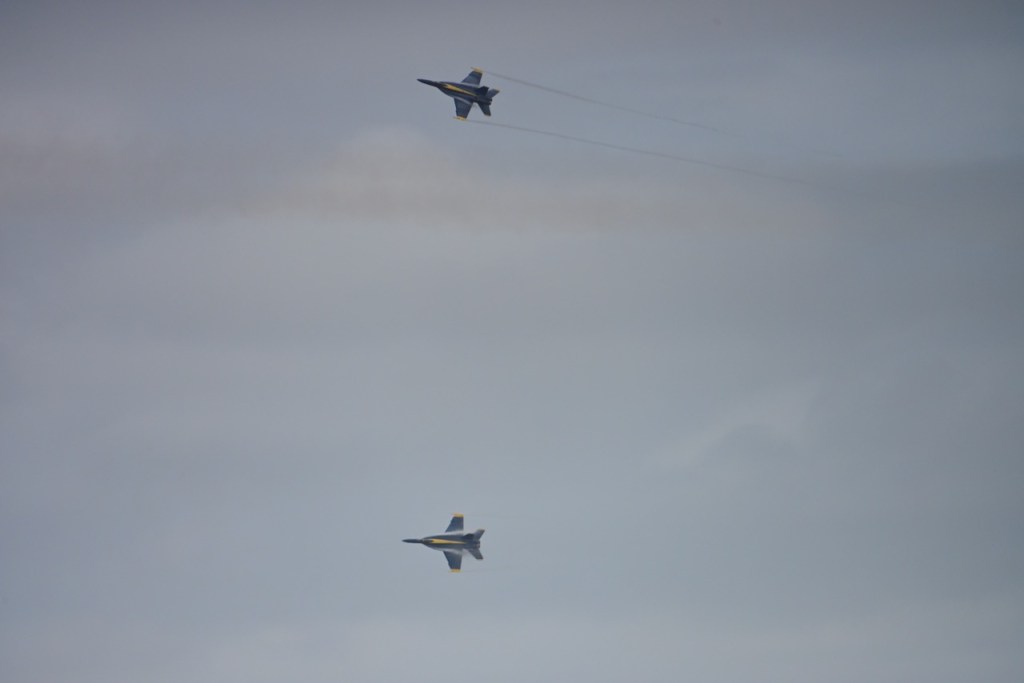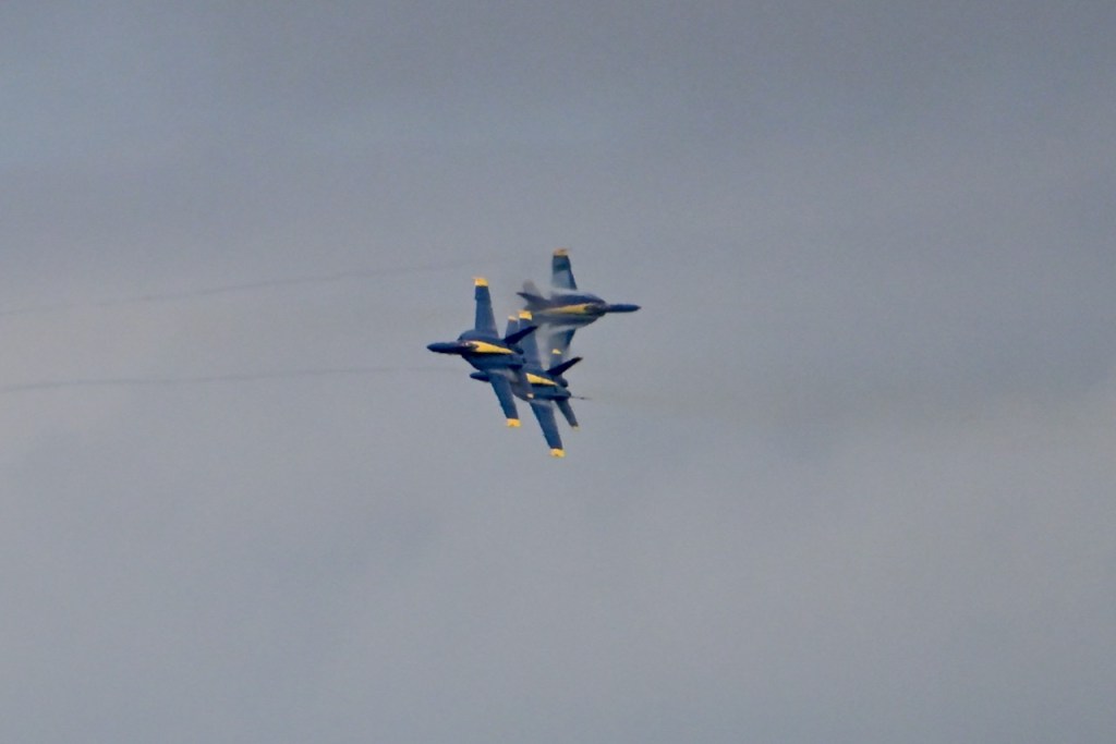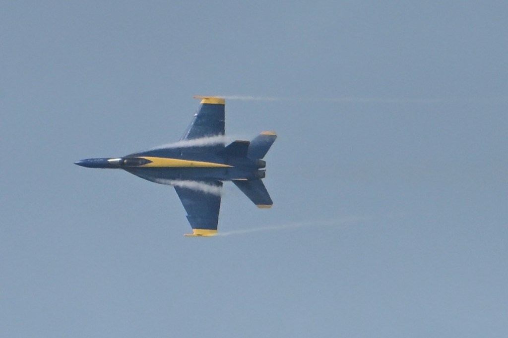 At the first day of practice for the Blue Angels, the sky became cloudy so it was harder to see the jets, but on some of the passes, you could see a cloud stream over the wings. I looked up what it is called: wing vapor, wingtip vortices, or vapor trails.