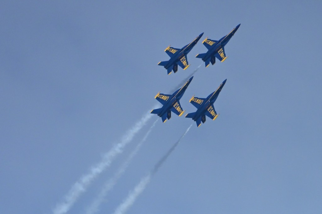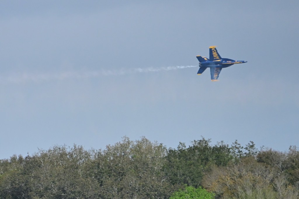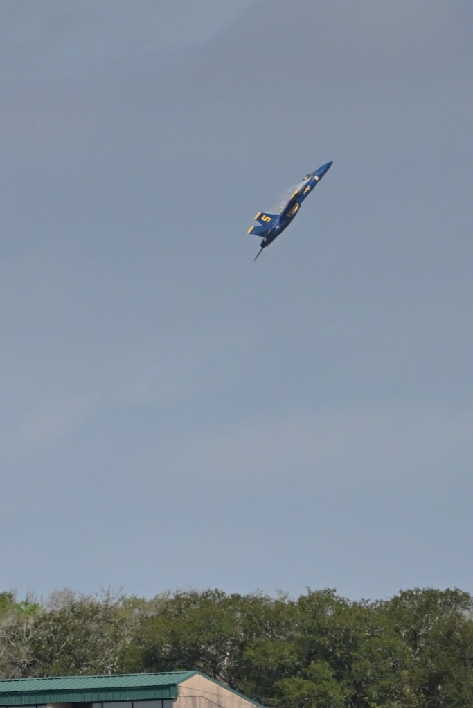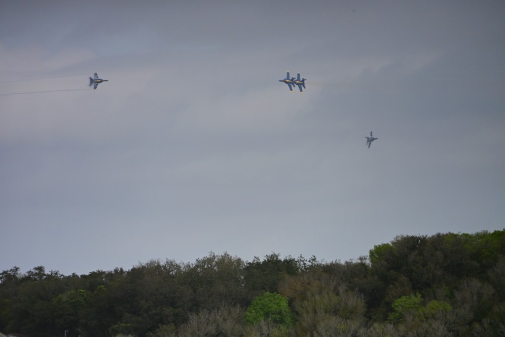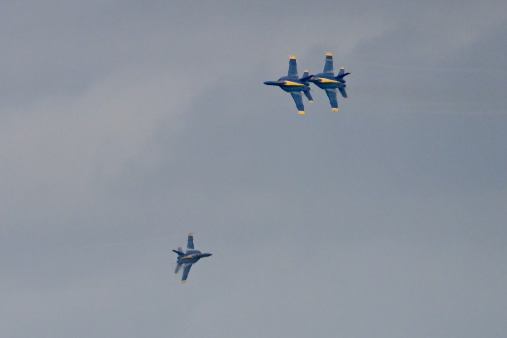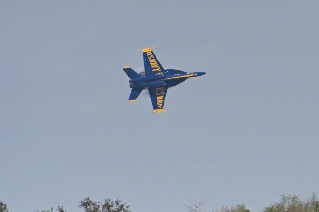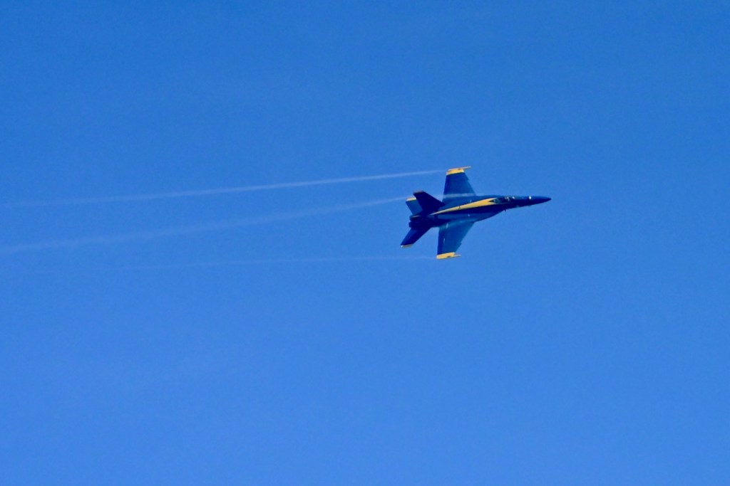 At the first day of practice for the Blue Angels, the sky became cloudy so it was harder to see the jets, but on some of the passes, you could see a cloud stream over the wings. I looked up what it is called: wing vapor, wingtip vortices, or vapor trails.