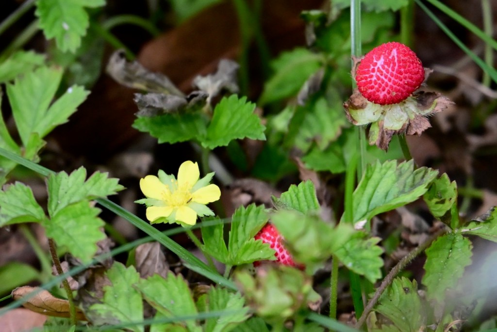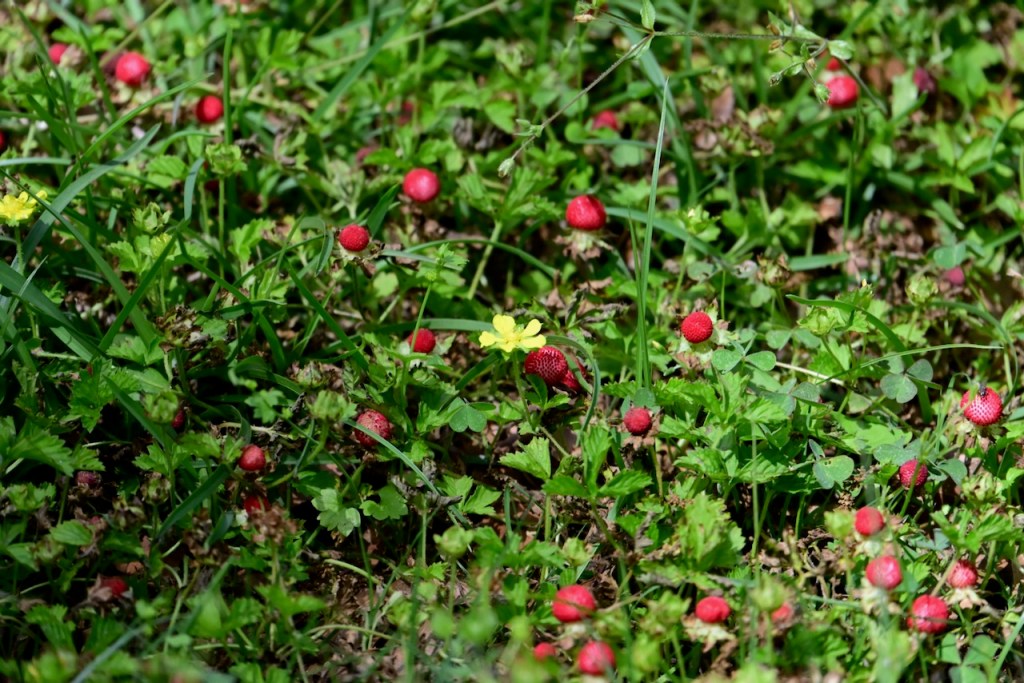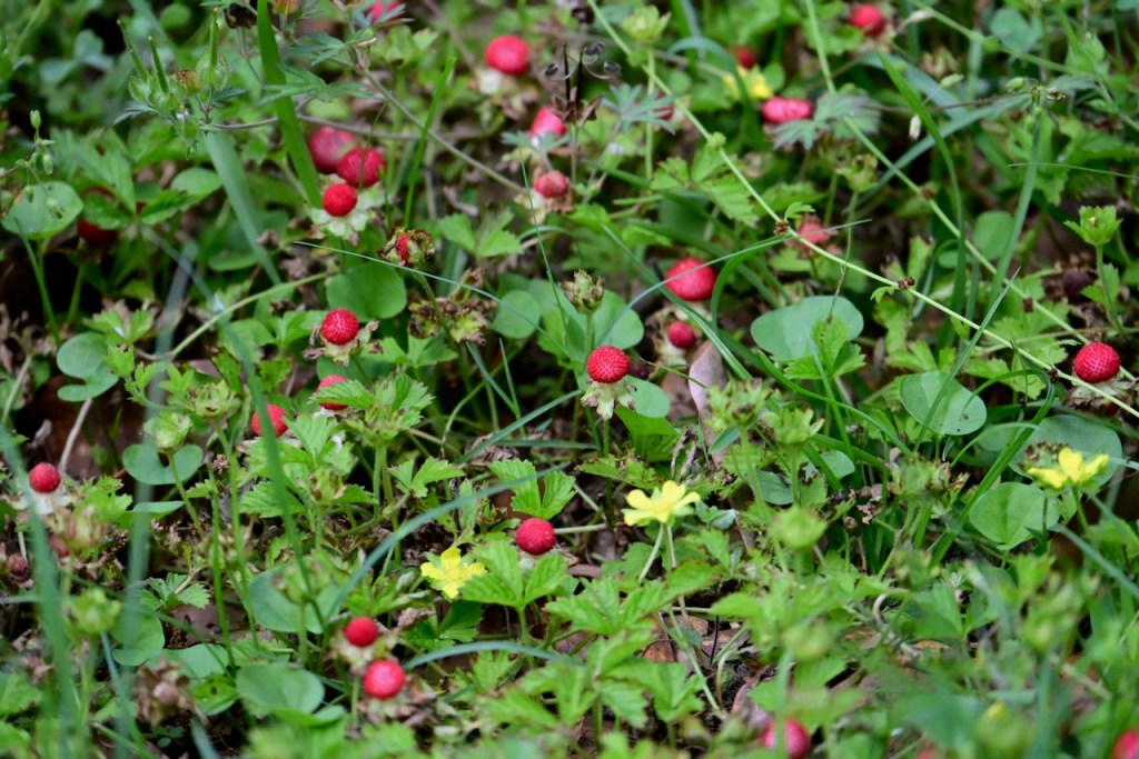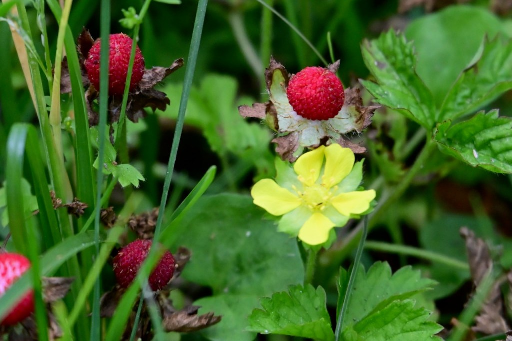 Known as Mock Strawberry, Indian Strawberry, or False Strawberry because it looks like wild strawberries but isn’t. The yellow flower and flavorless taste prove it is not a strawberry. It is pretty though.