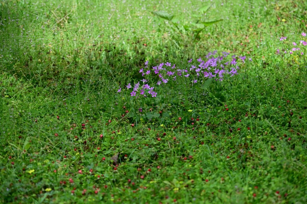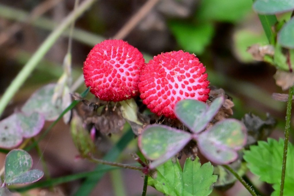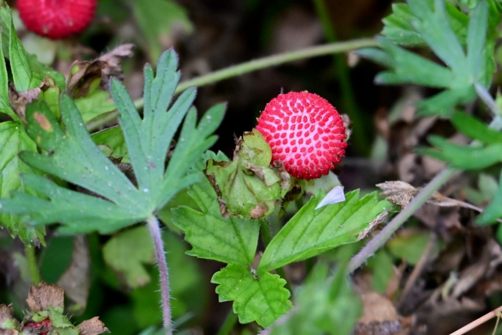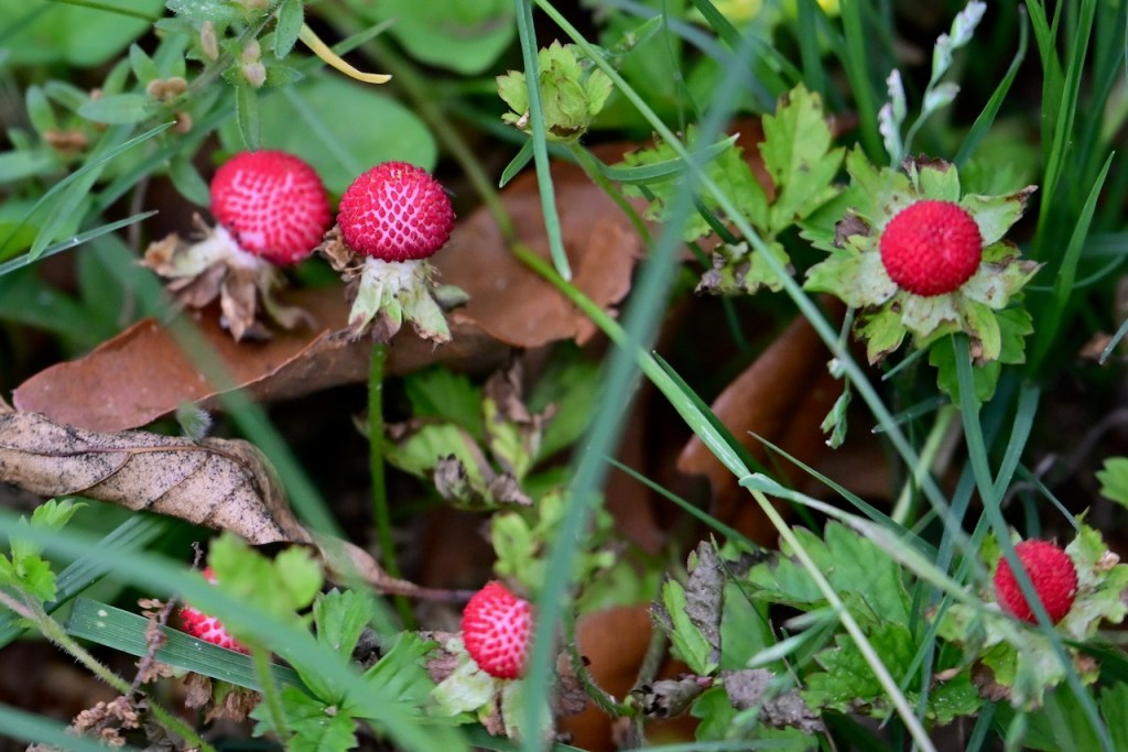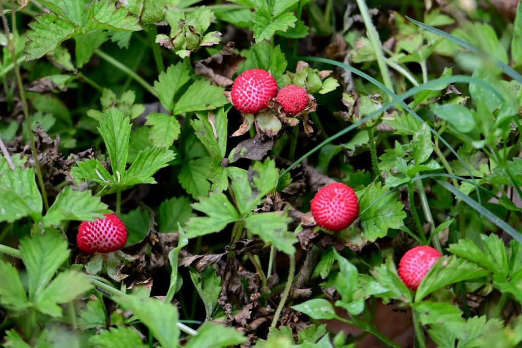 Known as Mock Strawberry, Indian Strawberry, or False Strawberry because it looks like wild strawberries but isn’t. The yellow flower and flavorless taste prove it is not a strawberry. It is pretty though.
