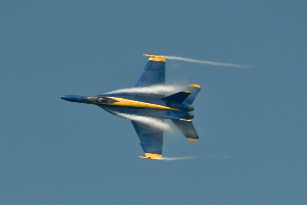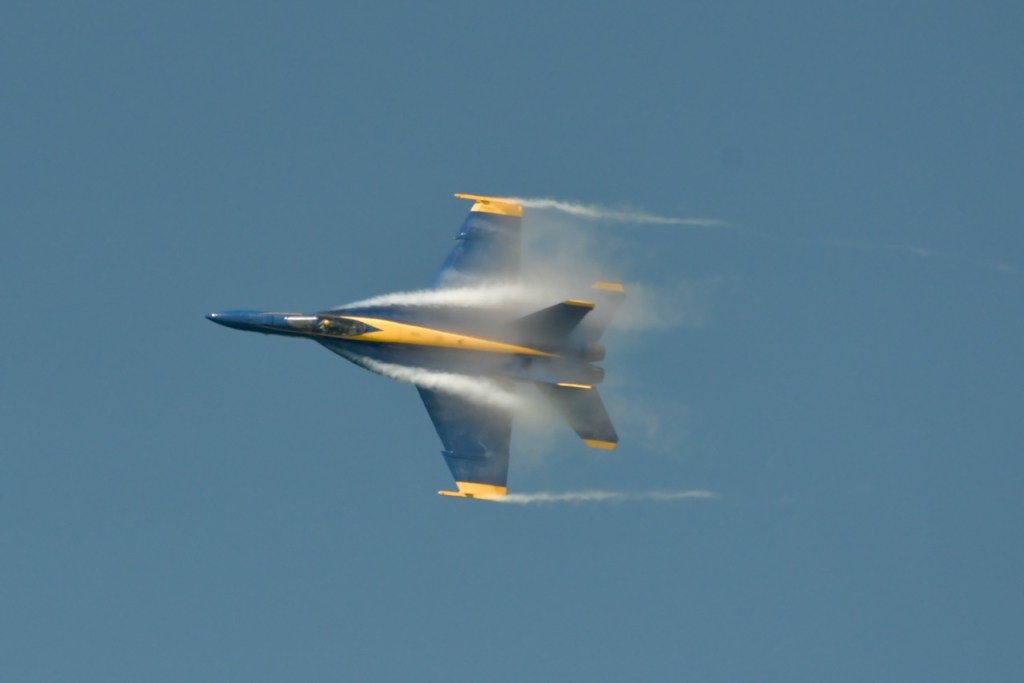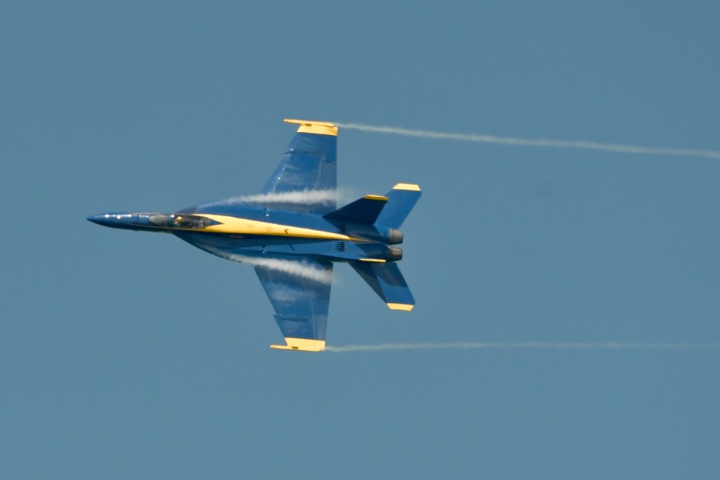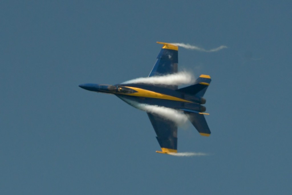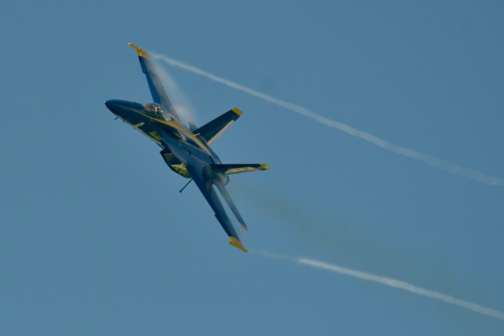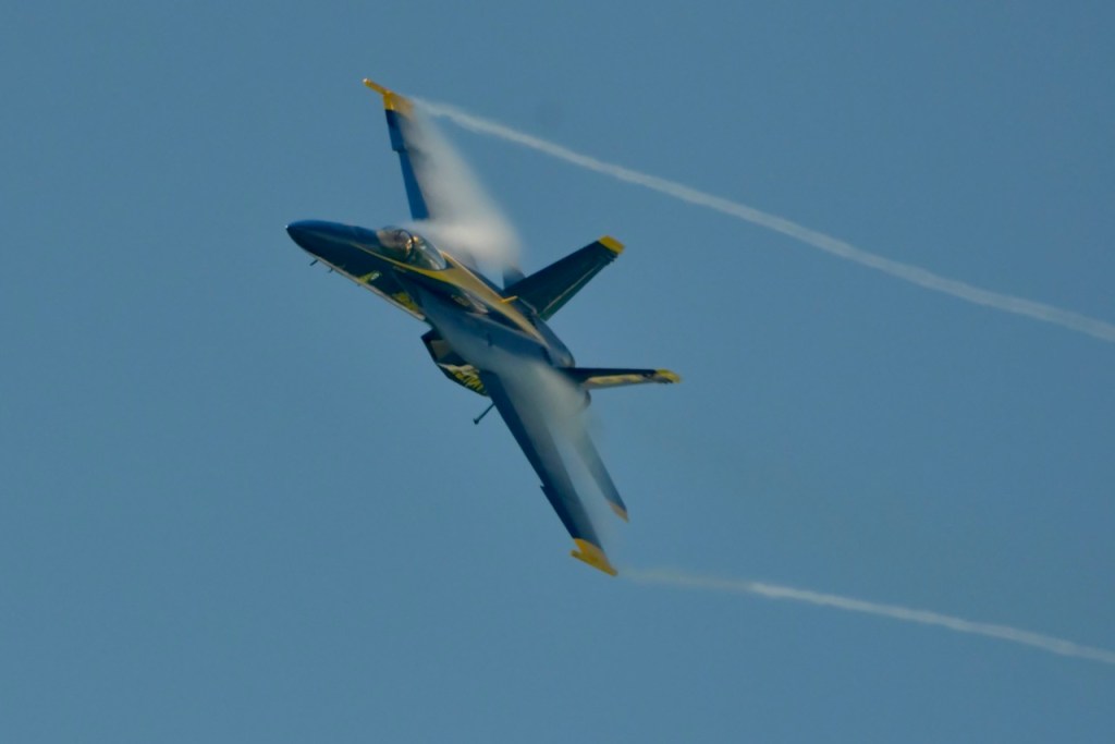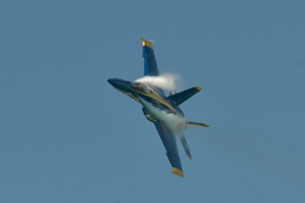 At the Blue Angel’s practice today, I took this sequence of photos of wingtip vortices. Wingtip vortices have to do with high and low air pressure below and above the wings. It creates a tornado-like air current over the jet. I do not remember seeing these during last year’s practices. I wonder if it has to do with the air temperature being cooler. The morning temperatures have started out in the 50’s with practice time temperatures being in the 70’s.