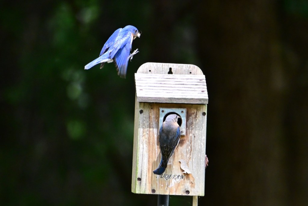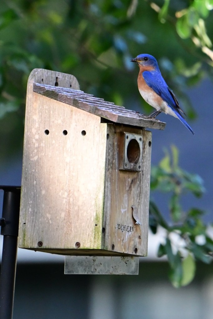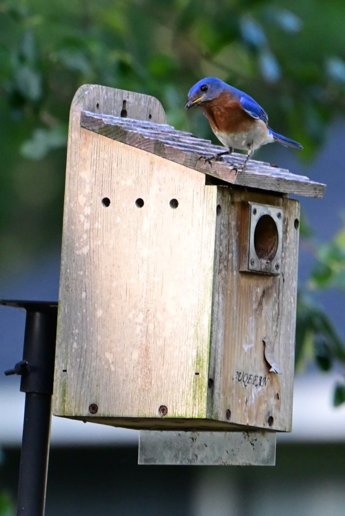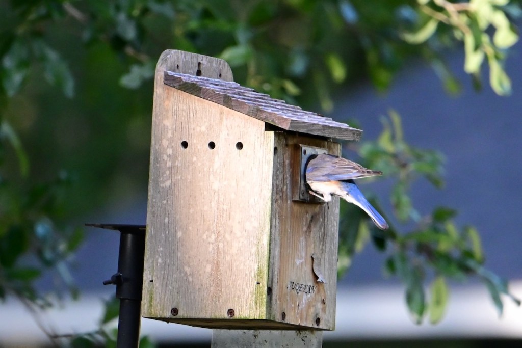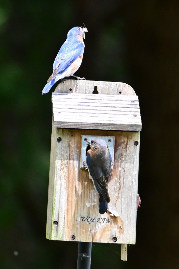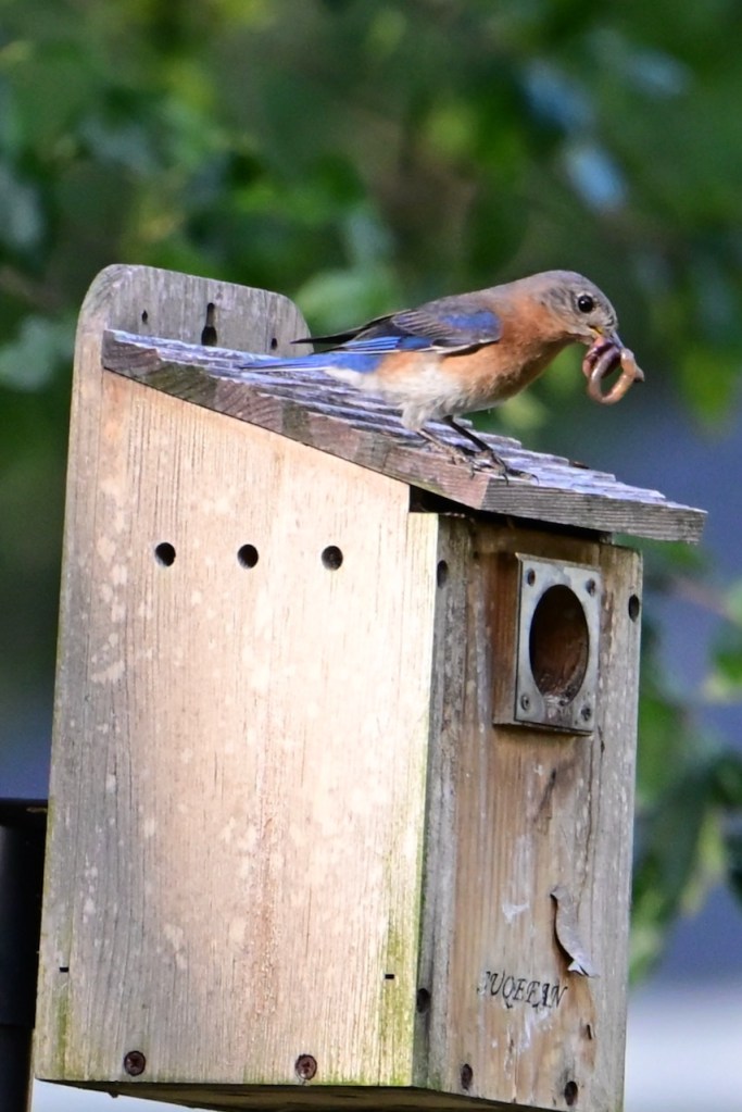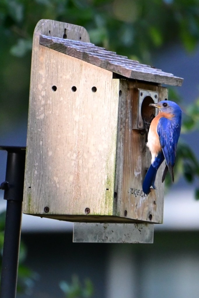 It is interesting to watch the Eastern Bluebird parents at feeding time. They never fly directly into the happy home after picking up food. They fly to a tree branch or the telephone wire and watch the area before flying to the top of the birdhouse. It could be they sense my presence and verify that I’m not a threat before feeding their babies. Both the male and female take turns with feeding. I’m sure they are worn out by the end of day because feeding takes place numerous times each day.