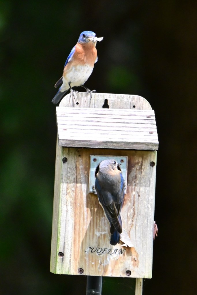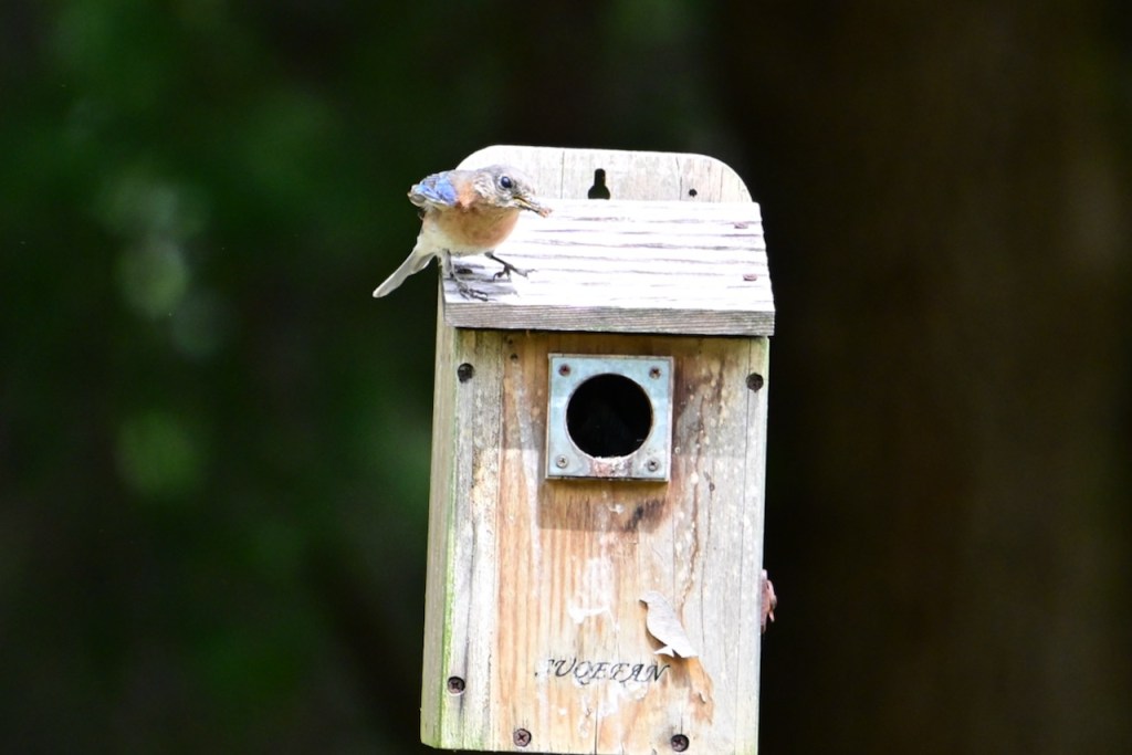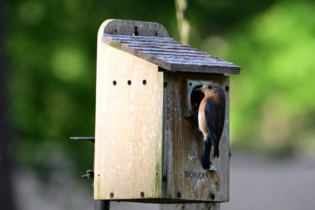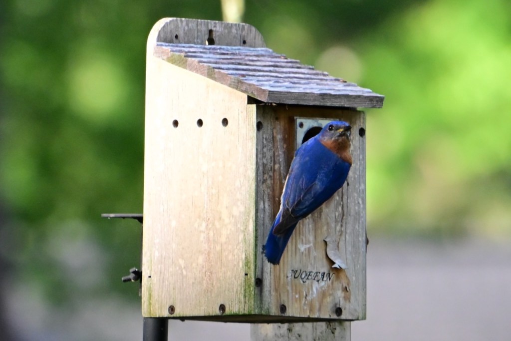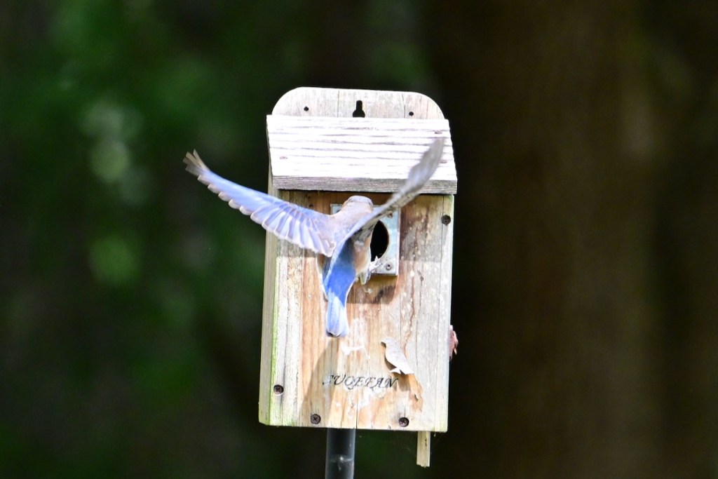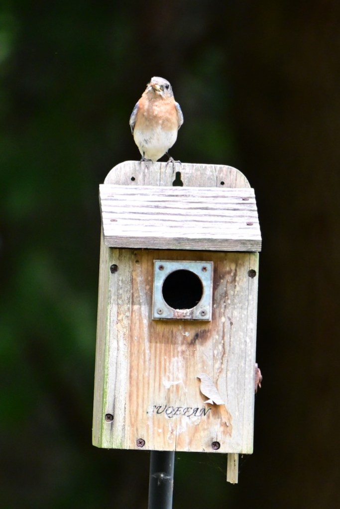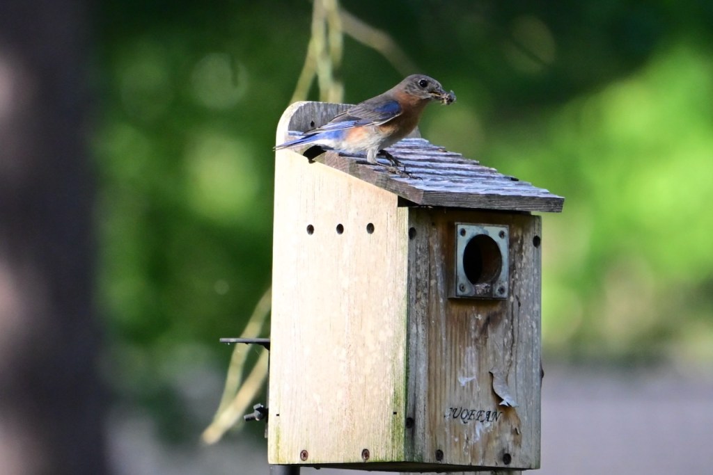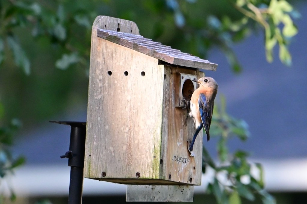 It is interesting to watch the Eastern Bluebird parents at feeding time. They never fly directly into the happy home after picking up food. They fly to a tree branch or the telephone wire and watch the area before flying to the top of the birdhouse. It could be they sense my presence and verify that I’m not a threat before feeding their babies. Both the male and female take turns with feeding. I’m sure they are worn out by the end of day because feeding takes place numerous times each day.