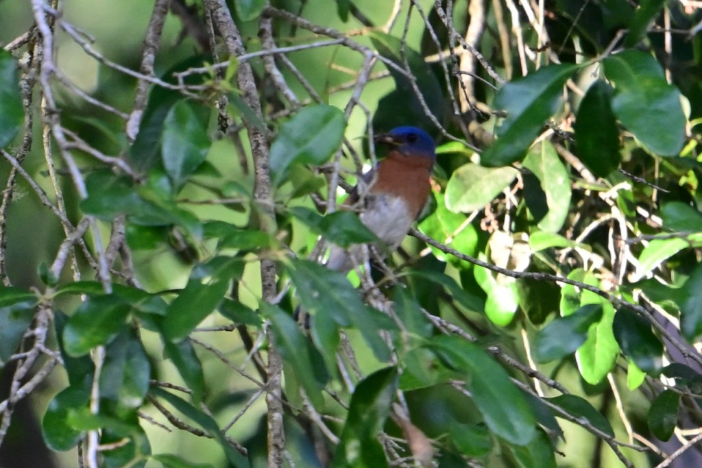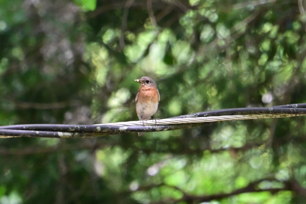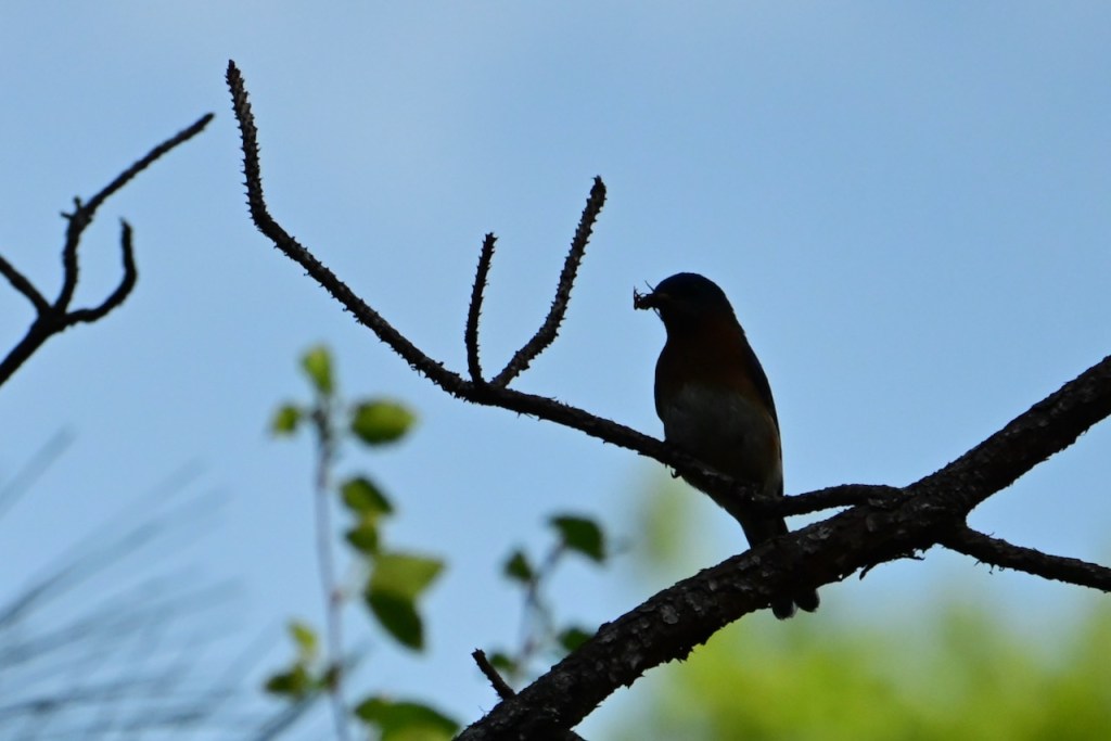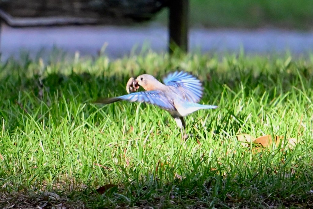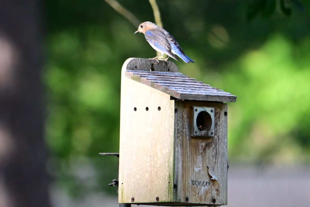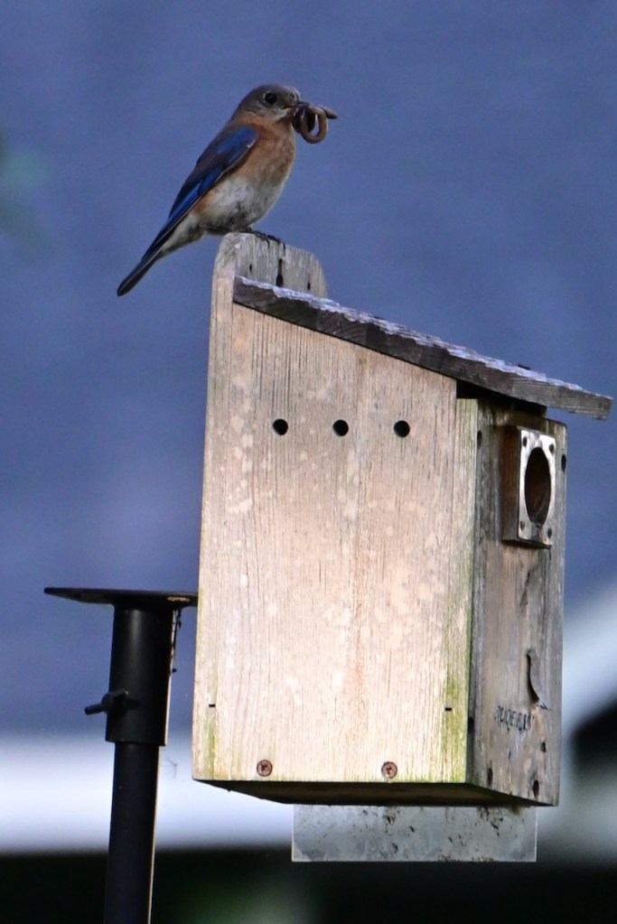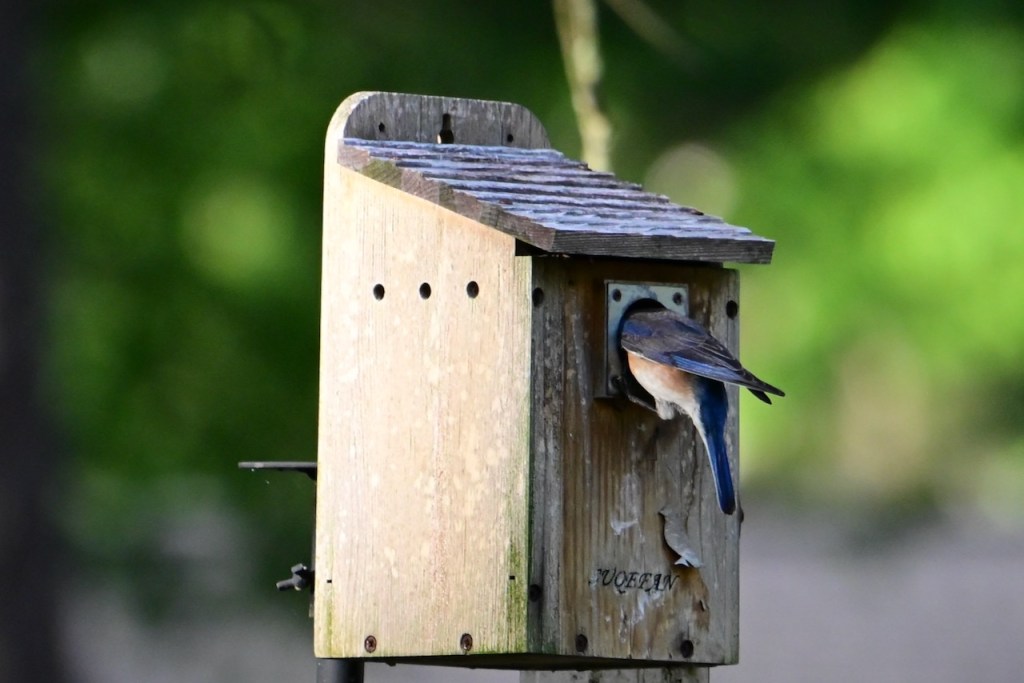 It is interesting to watch the Eastern Bluebird parents at feeding time. They never fly directly into the happy home after picking up food. They fly to a tree branch or the telephone wire and watch the area before flying to the top of the birdhouse. It could be they sense my presence and verify that I’m not a threat before feeding their babies. Both the male and female take turns with feeding. I’m sure they are worn out by the end of day because feeding takes place numerous times each day.