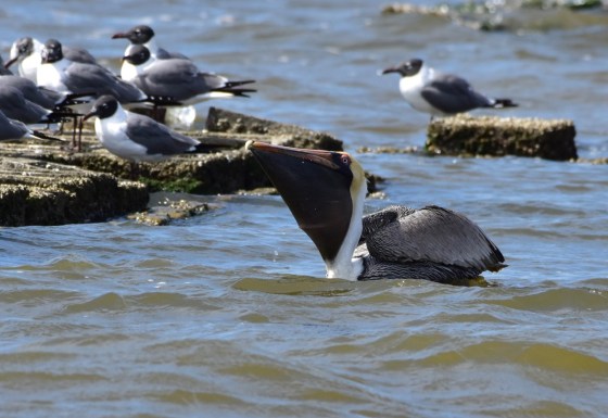 When foraging, Brown Pelicans may fly a few feet or considerably higher over a school of fish and dive at high … More