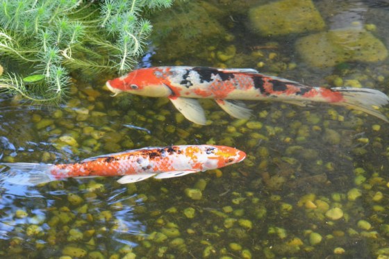 Koi are colored varieties of the Amur carp (Cyprinus rubrofuscus) that are kept for decorative purposes in outdoor water gardens.