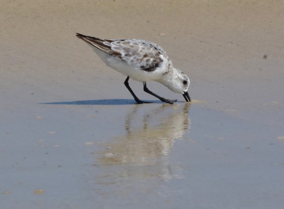 The Sanderling is a small, light-colored sandpiper with a straight, black bill and black legs.