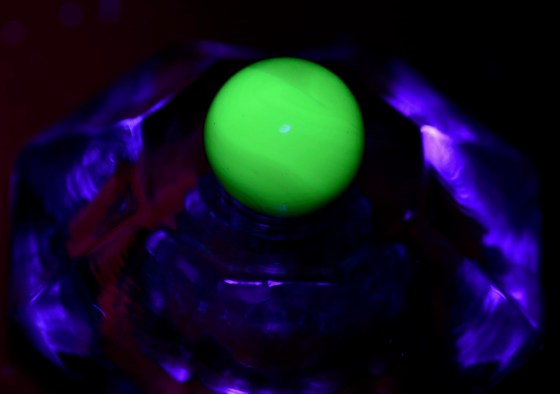 Glass mixed with Uranium Oxide will fluoresce yellow-green under a UV light.